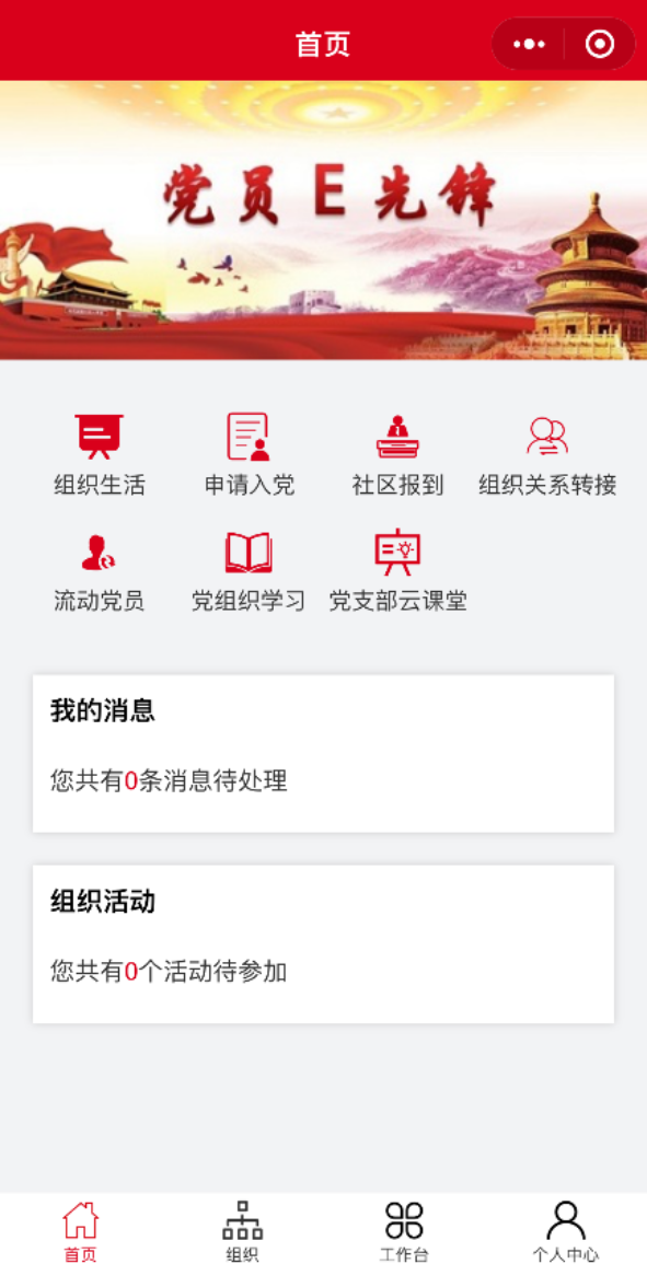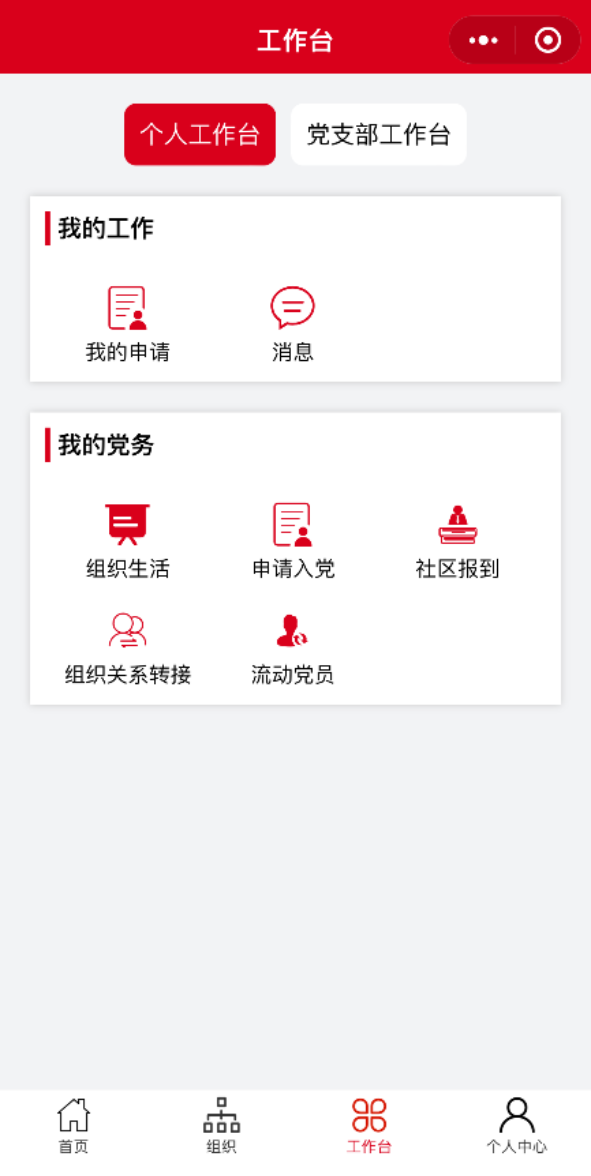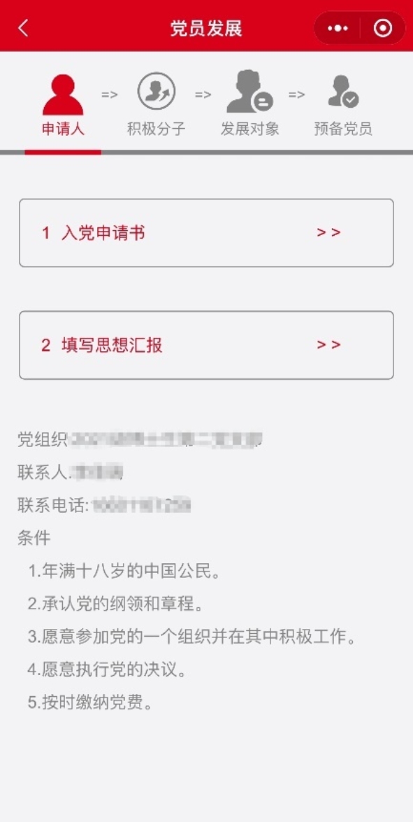 1.在首页中直接点击“申请入党”按钮,或在工作台-我的党务-中点击“申请入党”按钮,进入“党员发展”页面。