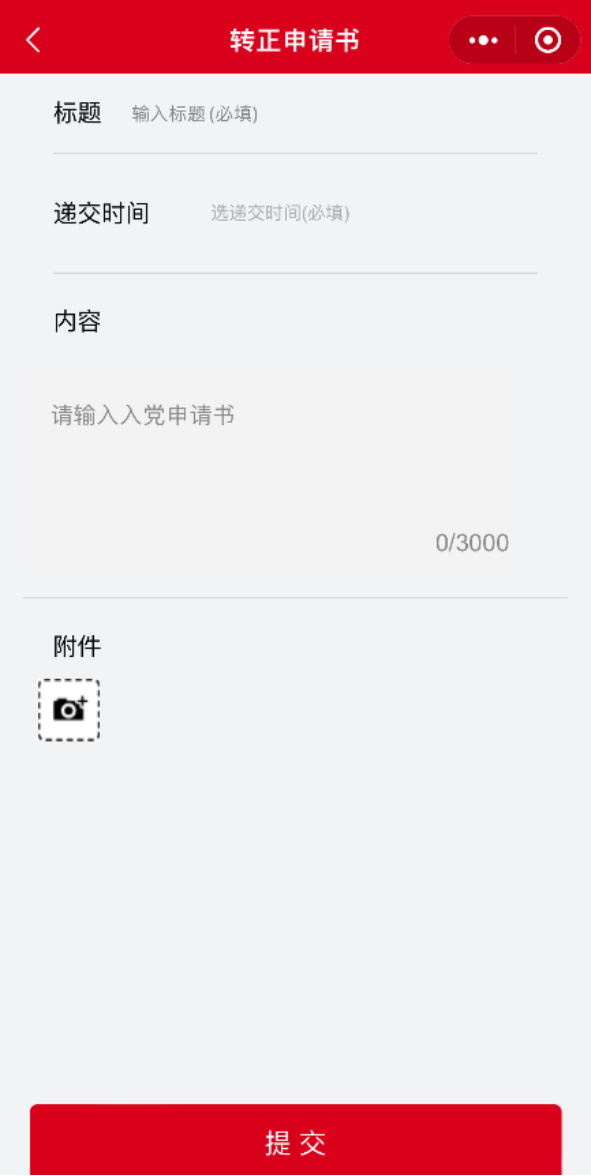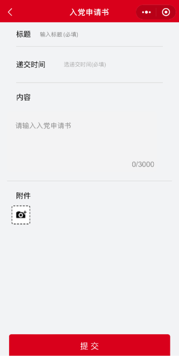 2.在党员发展页面,点击“入党申请书”,进入“入党申请书提交列表页面”,点击“新增”,进入“入党申请书详情页”,填写相关内容,上传附件后提交,等待支部管理员审批。对于已提交的入党申请书,通过向左滑动,还可进行删除。