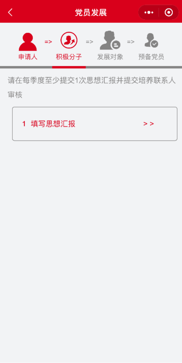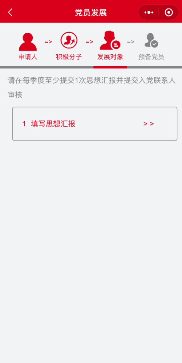 申请人在移动端提交的入党申请书,支部管理员审批通过后,申请人可提交“思想汇报”。