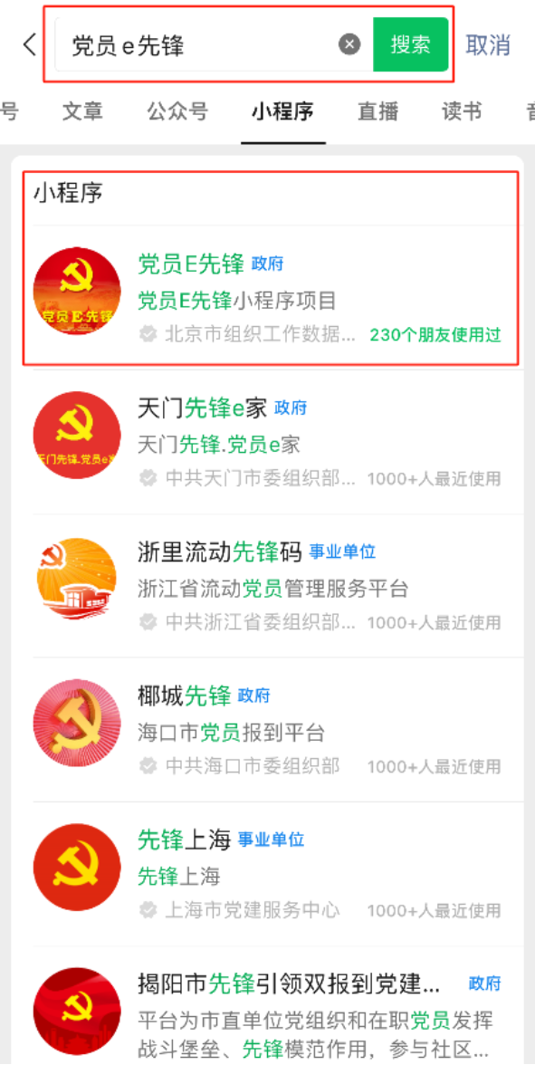 1.在微信小程序中,搜索“党员E先锋”。根据搜索结果,点击“党员E先锋”,登录进入微信小程序。