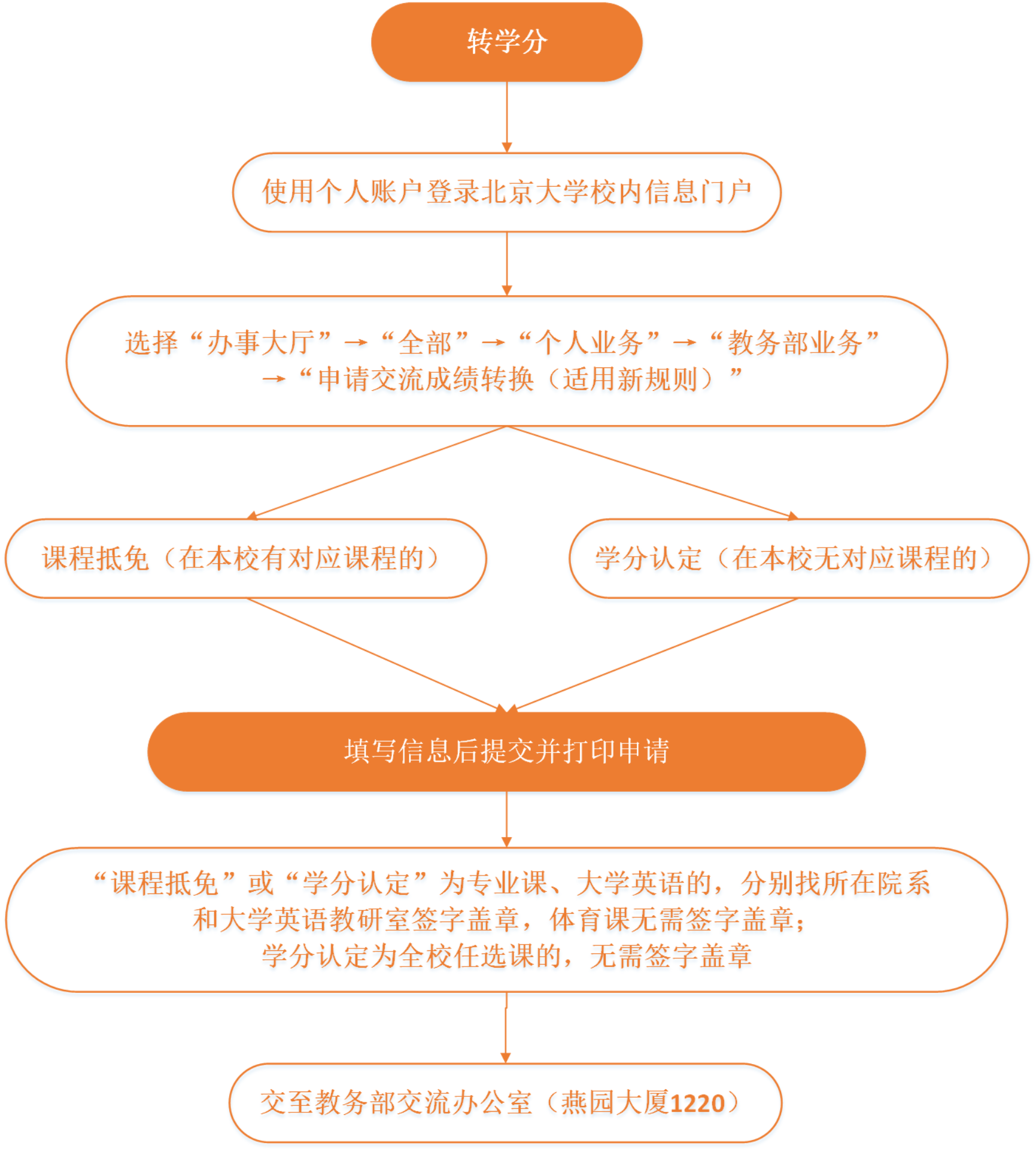 4、持申请表、成绩单原件和复印件至教务部交流办公室(燕园大厦1220)现场办理转学分手续。
