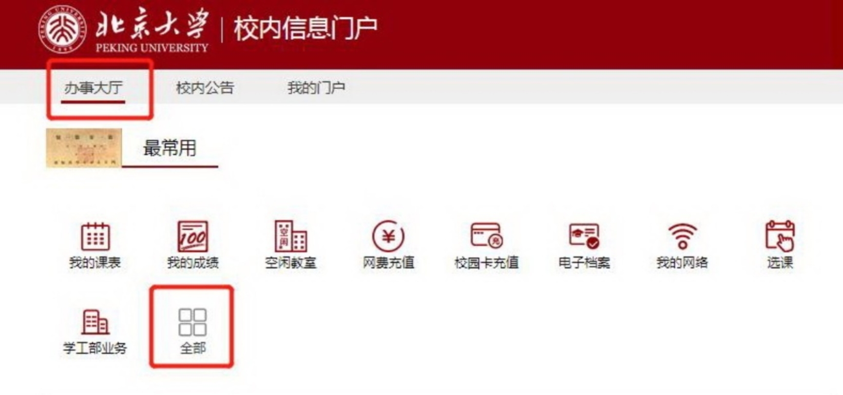一、登陆校内信息门户(点击请进),选择“办事大厅”——“全部”——“个人业务”——“教务部业务”。