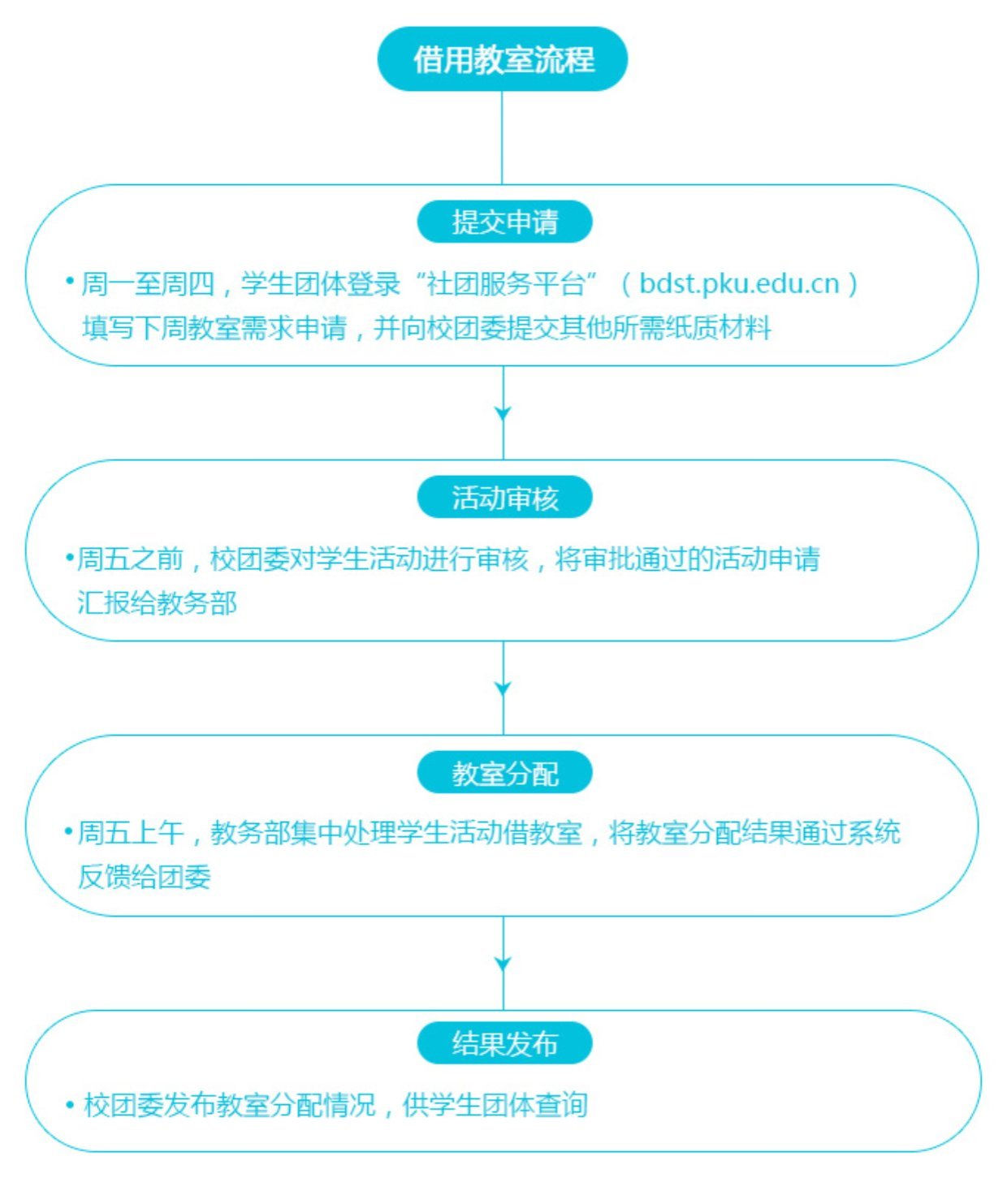 1、周一至周四工作时间,学生团体向校团委提出申请并办理手续(bdst.pku.edu.cn);当周只能申请借用下一周的教室