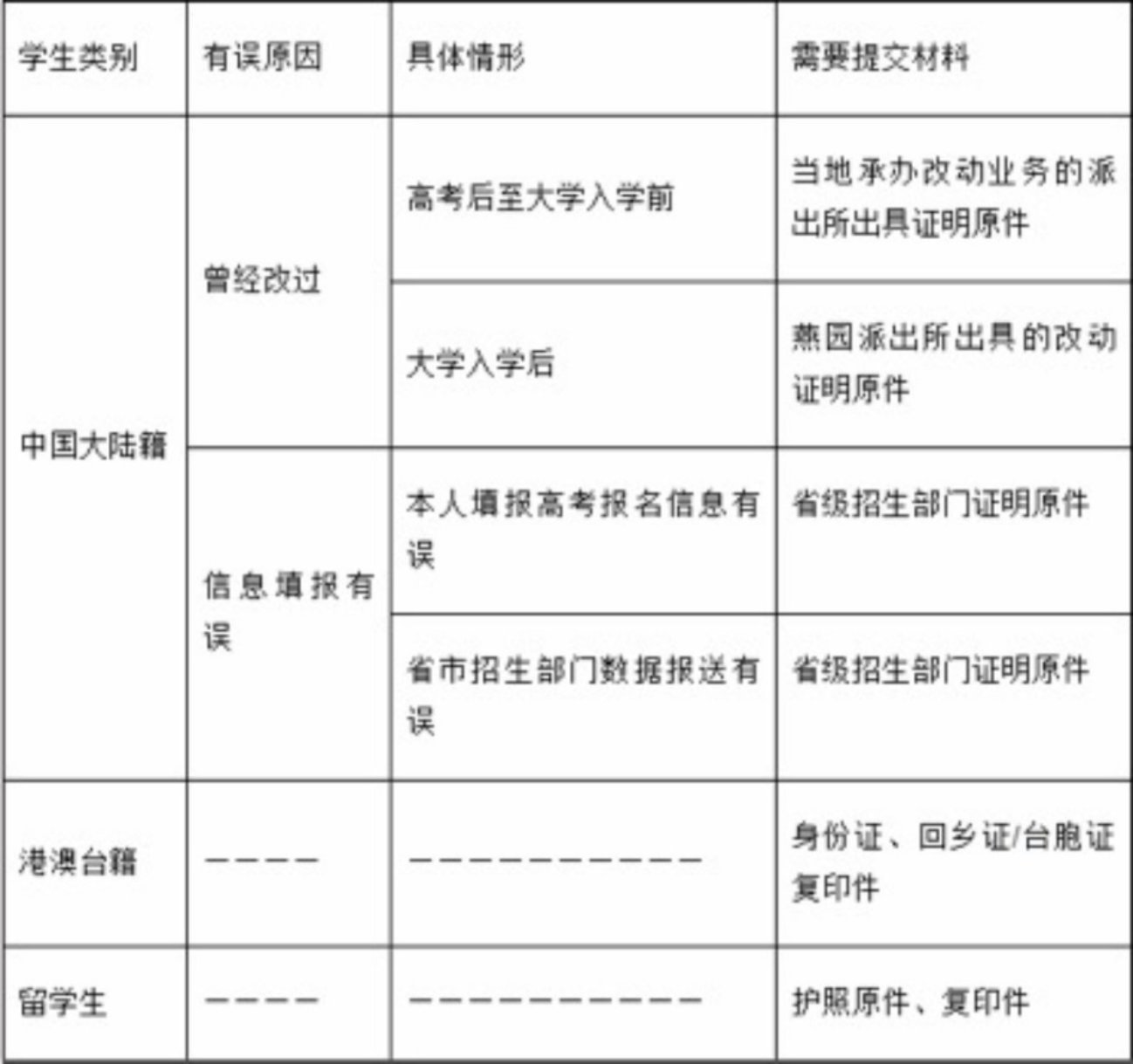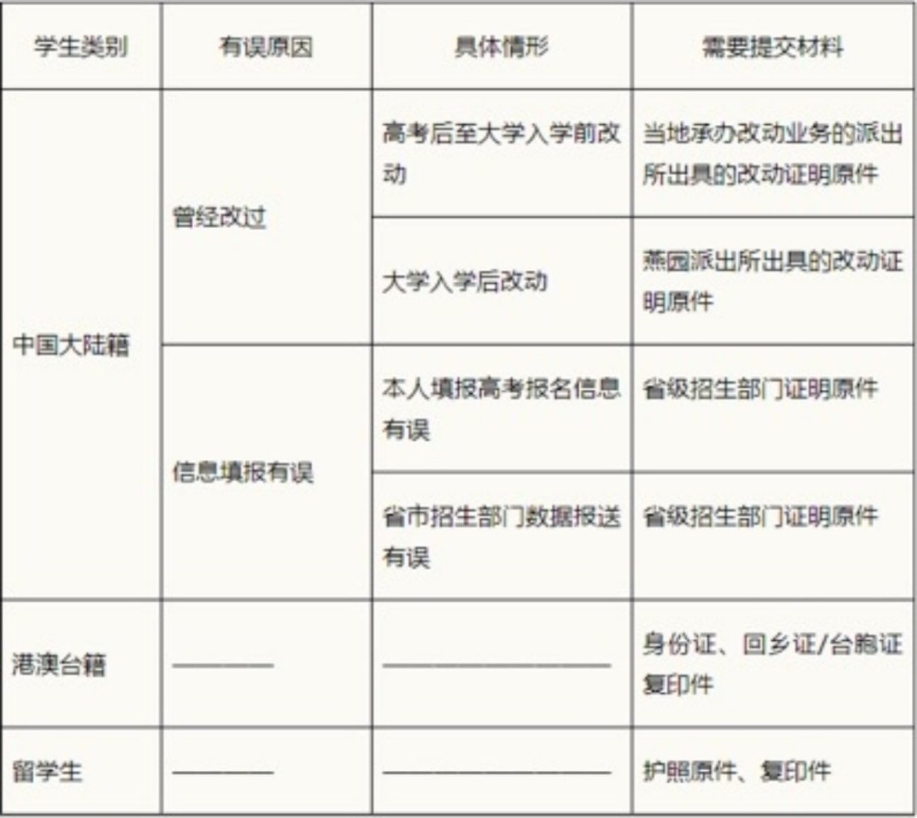 2、请仔细核对姓名、性别、出生日期、身份证号、生源地和民族信息,如与本人情况不一致,中国大陆籍和港澳台籍学生请联系教务部教务办公室(62751432)并按下表要求分类提交相应材料。留学生如信息与本人实际信息不一致,请联系留学生办公室(62751012)。