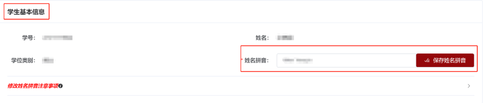 4.姓名拼音(护照、通行证英文名)将用于制作学位证书及英文副本,请务必认真修改。