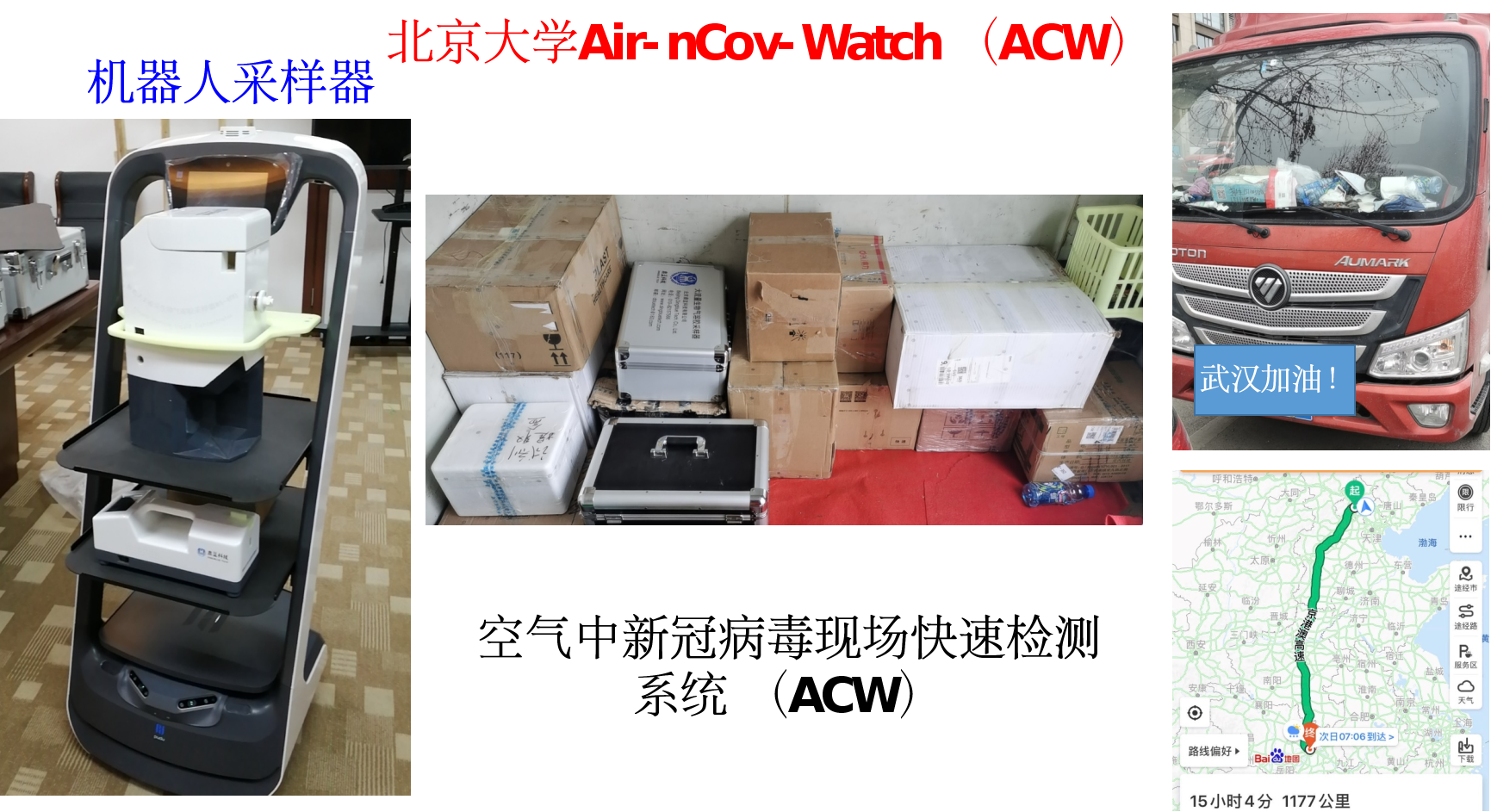 2019年底发生在武汉的新冠状病毒疫情防控中,环境多介质病毒检测与重大环境风险评估是亟待解决的技术问题。北大环境学院要茂盛教授团队对现有北京大学的国家发明专利(ZL 2016 1 0857255.9)进行改造升级,集成北大和企业合作研发的大流量空气采样(每分钟采集400升空气)与现有商业化机器人、现场快速提取病毒RNA与核酸扩增等技术,创建了现场空气中新冠病毒快速检测系统Air-Cov-Watch(ACW)。通过利用可规划路线的机器人空气采样,可以针对医疗环境以及公共场所进行程序化扫描式地采集气溶胶样品,无需人员进入即可获取在任何区域的气溶胶样品,然后指令机器人将样品送到指定地点,工作人员可以对气溶胶样品中新冠病毒展开现场快速检测。该系统对医疗环境干扰少、空气样品更具有代表性且可以持续自动获取样品。ACW系统于2月26号通过专车送达武汉。