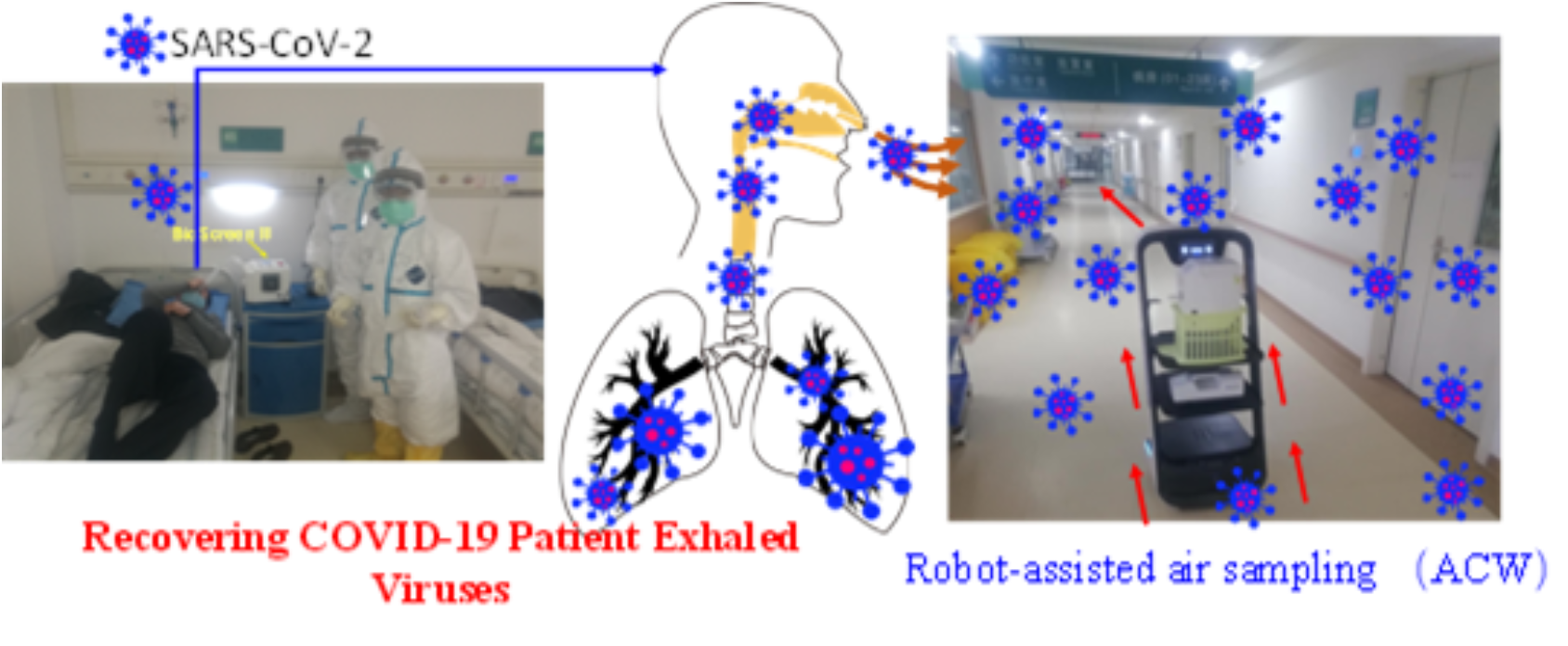 北大环境科学与工程学院要茂盛教授与江苏省疾病预防与控制中心朱宝立主任、周连副主任医师团队在武汉四家医院开展了对拟出院新冠患者呼出气与环境空气、物表等的新冠病毒监测。团队共招募了近10名新冠患者(9名咽拭子连续转阴,即将出院),4名非新冠呼吸系统感染人群,并收集了这些人群的呼出气冷凝液。利用RT-PCR(核酸扩增)发现这些拟出院新冠患者(咽拭子转阴)中有两名患者呼出气中检测到了新冠病毒的核酸,估算每小时排放高达7万多个。团队同时也采集了318份新冠患者所处环境相关的物表样品,并对其进行了新冠病毒检测,阳性率为3.1%,其中包括医护人员经常接触/使用的面罩和轮班楼层等医疗设备(每平方厘米大概含有3-8个病毒(数字PCR结果))。此外,团队对医疗环境(医院走廊、病房等)空气进行了采集,包括利用集成研发的机器人采样器,在采集到的44份空气样本中,有三份空气样本经数字PCR检测呈阳性,其浓度水平为9-219个病毒每立方米。