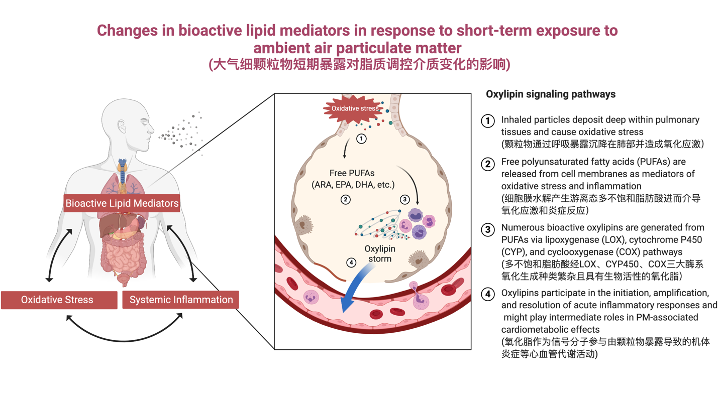 研究发现,PM2.5短期暴露增加显著改变了白三烯、单羟基类多不饱和脂肪酸、二羟基类多不饱和脂肪酸、前列腺素等氧化脂的体内浓度水平;研究同时发现了超细颗粒物(ultrafine particles, UFPs)暴露增加与氧化脂浓度变化的稳健关联。这些结果表明,由多不饱和脂肪酸代谢产生的氧化脂可能是大气PM2.5暴露的重要生物标志物。多种标志物组成了复杂的脂质调控信号网络,其变化可能会进一步介导体内炎症等心血管代谢过程的启动、放大和消退。该研究明确了空气污染对脂质调控介质的影响,同时加强了学术界对空气污染诱发心血管代谢疾病早期机制的认识。