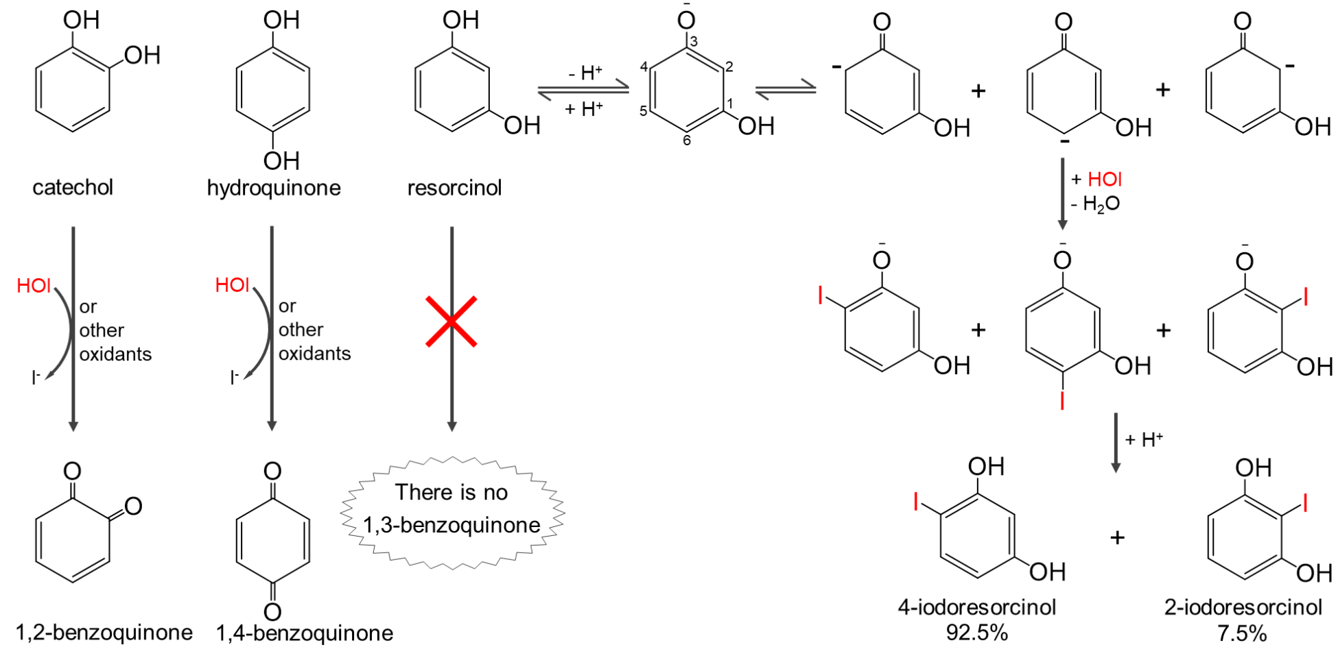 针对这一问题,本研究利用GC-ToF-MS,采用电子捕获电离技术对2016-2018年北京地区PM2.5中OICs进行特异性识别;结合重氮甲烷衍生和电子轰击电离,对识别的OICs进行结构鉴定及定量分析。研究共识别出41种OICs,确定了其中37种物质的分子结构,包括18种碘代萘酚和19种碘代间苯二酚,并用标准品确证了6种。研究发现OICs在采暖季具有高浓度,可以排除海洋源的影响,表明煤炭燃烧是内陆城市地区大气中碘和颗粒相碘代萘酚类物质的重要来源。碘代间苯二酚与臭氧的相关性指征其二次生成来源。研究中仅识别到2-和4-碘代间苯二酚,而无5-碘代间苯二酚或碘代邻/对苯二酚,指示了颗粒物表面次碘酸(HOI)与间苯二酚发生的亲电取代反应二次生成机制。本研究为大气碘化学中颗粒相OICs的生成机制提供了直接证据,暗示了酚类物质的非均相过程中卤素参与的亲电取代反应可能是一条重要的反应途径。