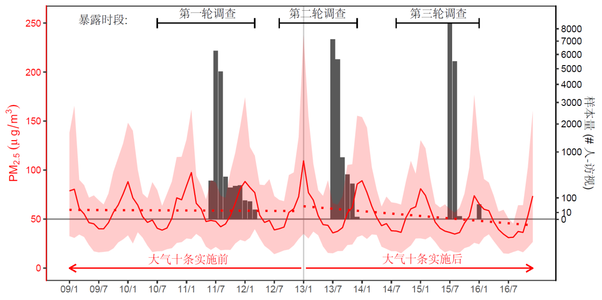 图 1. 大气十条实施前后调查城市平均PM2.5浓度变化趋势(红色时间序列图和左侧y坐标)及三次访视期间人群调查的时间段(灰色柱状图和右侧y坐标)