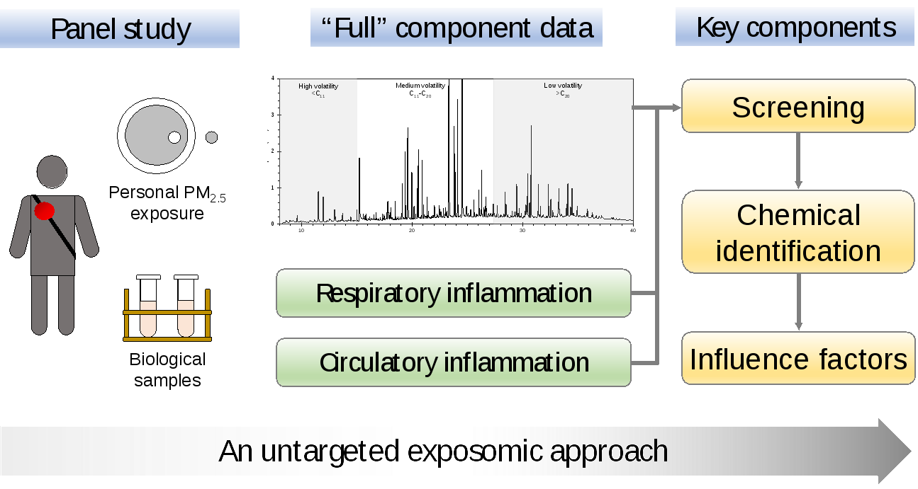 有机组分是大气细颗粒物即PM2.5的主要危害因素,但是受分析技术限制,长期以来缺乏对危害组分的系统认识。为此环境健康团队开发非靶向暴露组学技术,系统识别个体暴露PM2.5中主要效应组分。