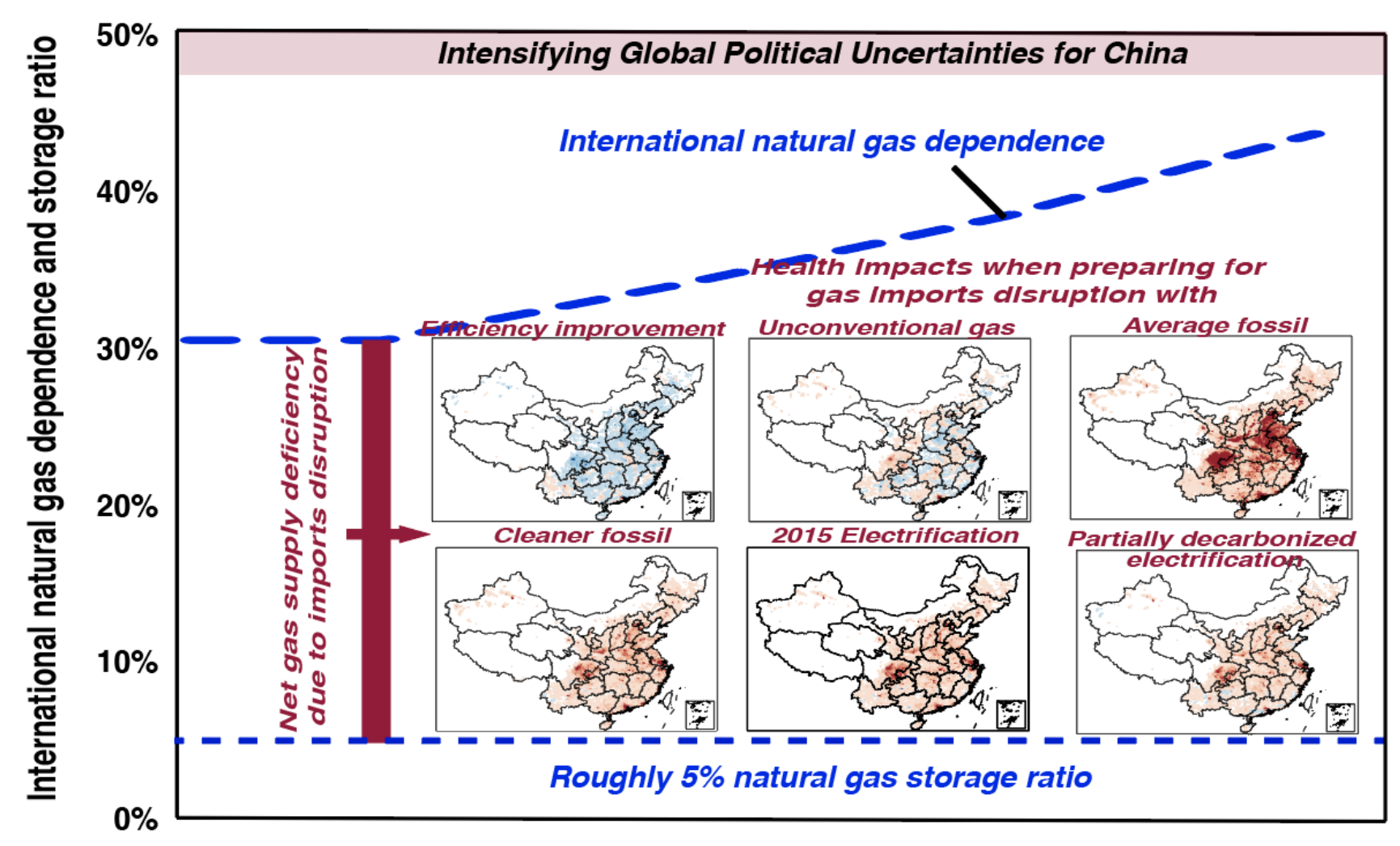 研究团队使用综合评估框架(情景分析-排放模型-空气质量模型-健康模型),识别系列应对潜在国际天然气供应中断方案的空气质量、温室气体排放和水资源压力等环境影响和相关健康损失。研究发现,以提升终端能源效率的方式弥补进口天然气供应中断是目前能同时改善空气质量(以及人体健康)、减少温室气体排放并缓解水资源压力的方案。如以当前以煤为主的能源结构弥补进口天然气供应中断,将导致空气污染、温室气体排放和区域水资源压力的增加,并导致PM2.5相关的额外过早死亡人数增加23,300 (95% CI: 22,100-24,500) 人。基于较为清洁的化石燃料燃烧技术、非常规天然气、以当前或未来更为清洁的能源结构提供电力来弥补天然气进口中断虽然能显著降低当前化石能源结构直接弥补的空气污染和健康代价,但仍会导致一定量的额外空气污染物和温室气体排放,以及水资源消耗。