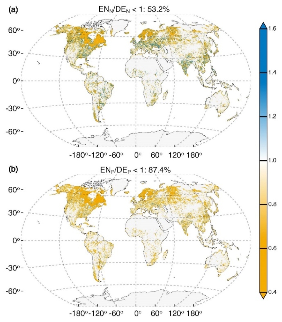 图 全球湖泊的氮磷截留结果分布,其中(a) 和(b)分别代表氮和磷的湖内EN/DE比值(enrichment/depletion)。