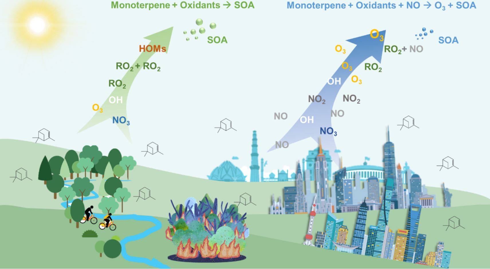 森林低NOx环境(左)和城市高NOx环境(右)下,单萜烯氧化产生不同结果