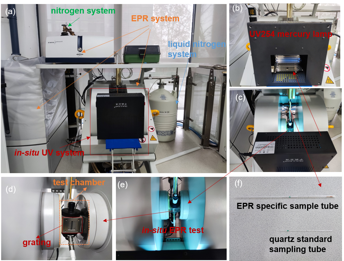 原位EPR系统:(a)EPR仪器配备原位UV反应器、氮气系统、液氮系统和循环水系统;(b)UV 254汞灯;(c)原位EPR系统的实验测试;(d和e)原位实验的反应腔和光栅;(f)石英标准取样管和EPR专用样品管。