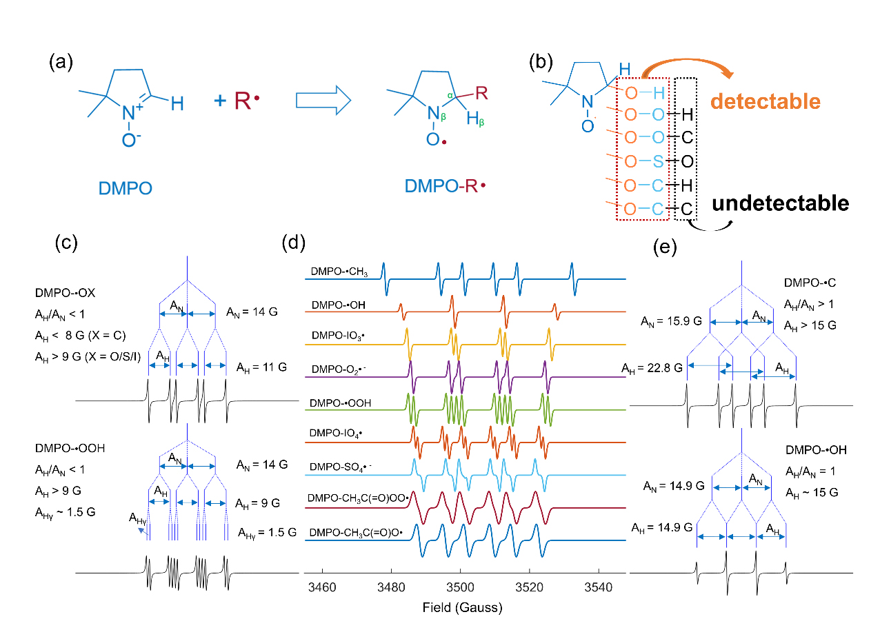 DMPO与自由基加成后的EPR谱图特征:(a)DMPO对R•的捕获(R代表自由基基团,如OH、OOH、CH3、OCH3等);(b)DMPO自旋加成物中的可检测范围;(c)典型AOP体系中DMPO-•OX和DMPO-•OOH自由基加成物的超精细裂解图;(d)AOPs体系中典型的DMPO自由基加成物的EPR模拟图谱;(e)典型AOP体系中DMPO-•C和DMPO-•OH自由基加成物的超精细分裂图。