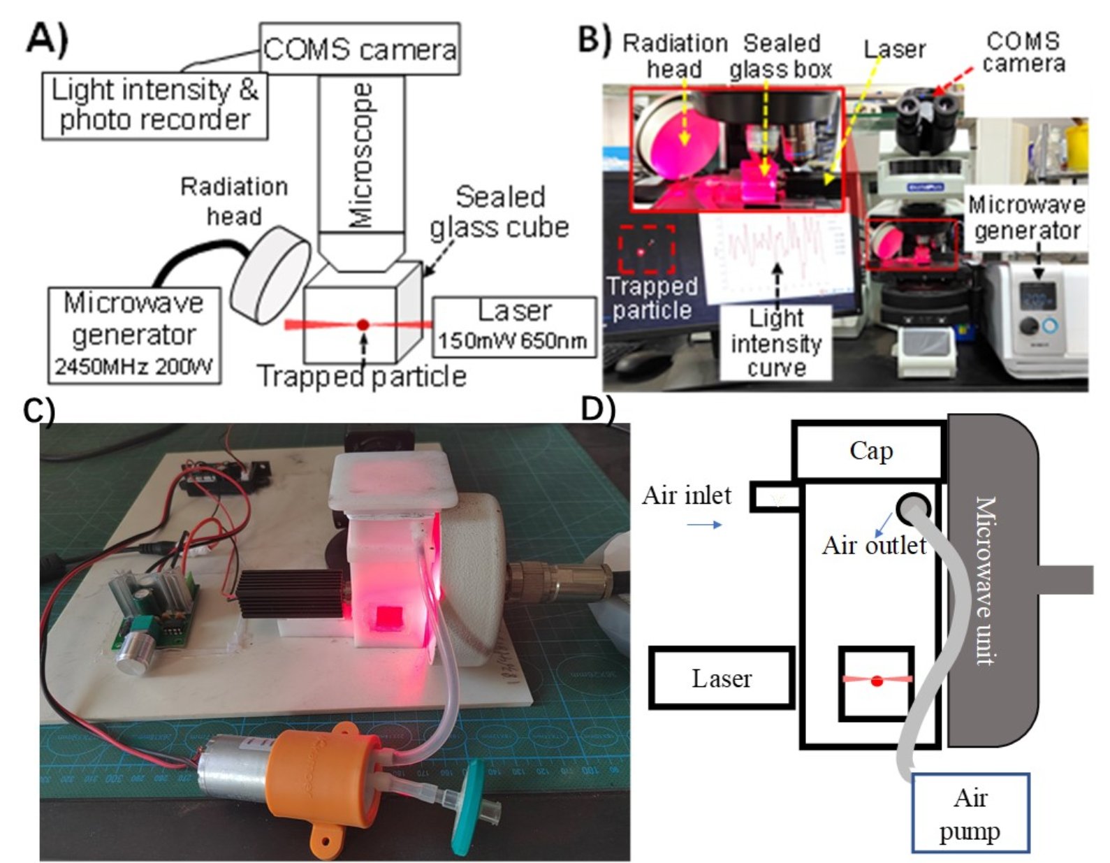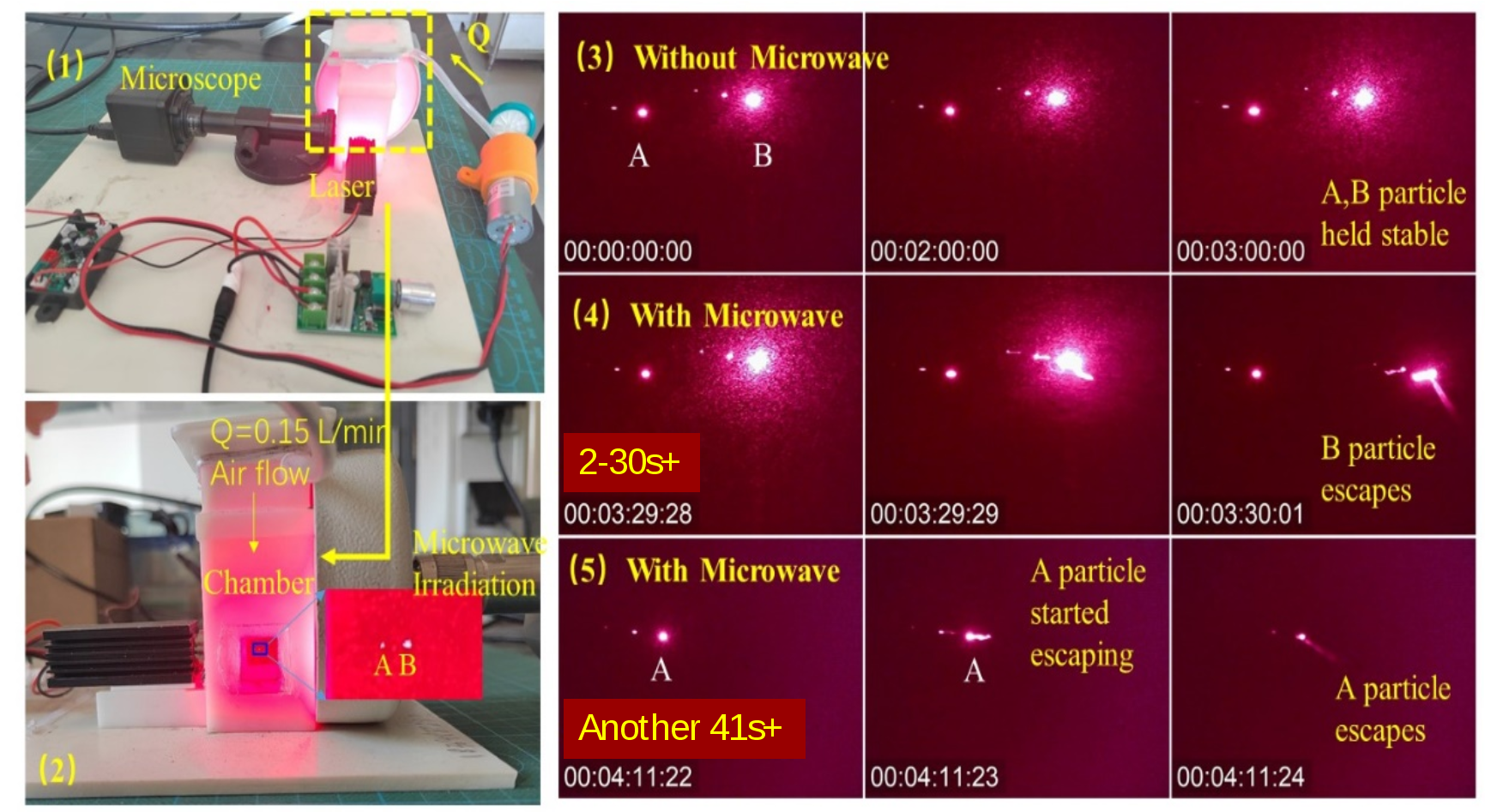 在国家自然科学基金委的支持下,课题组经过两年多的努力,集成激光原位捕获与微波辐射创建了空气中单个活性生物粒子可肉眼识别系统(BioAeroLMD)。近日,该项研究以“Single viable fungal aerosol particle discerning using naked eye assisted with laser trapping and microwaving “为题在线发表在Atmospheric Environment刊物上 (https://www.sciencedirect.com/science/article/abs/pii/S1352231022005003 )。课题组将三种真菌孢子包括黑曲霉、米曲霉和哈兹木霉以及三种非生物颗粒如MnO2、活性炭和Fe3O4通过激光悬浮固定在在一个自制玻璃立方体内的空气中。当微波辐射时,观察到一些被激光捕获的真菌孢子迅速逃离捕获,发生漂移,甚至突然破裂。 相比之下,其它被捕获的非生物颗粒在微波辐射下没有发生明显的变化。对于所有测试的粒子包括生物和非生物颗粒,微波辐射导致粒子在捕获区域内移动,然后在新的地方达到平衡。有活性的生物粒子发生逃逸,而非生物粒子保持相对稳定。 根据粒子类型和照射时间,生物粒子和非生物粒子在辐照时光散射特性也存在差异。终止微波辐射可使非生物粒子返回最初被捕获的位置。使用所发明的系统,我们可以通过简单地观察形态学和物理飘逸来肉眼识别有活性的单个微生物气溶胶颗粒。