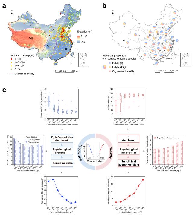 北京大学环境科学与工程学院倪晋仁课题组在《Nature Communications》上发表论文,首次在大陆尺度上将地下水碘环境监测、甲状腺疾病流行病学调查方法结合开展健康风险评估,揭示了高碘和低碘区域优势碘形态与典型甲状腺疾病类型的响应关系,构建了地下水碘元素“环境赋存-饮用摄入-人体代谢-实际患病-风险预测-防控措施”的健康风险全链条研究范式,减小了地下水碘健康风险评估的不确定性,提出了因地制宜的优化供碘建议。