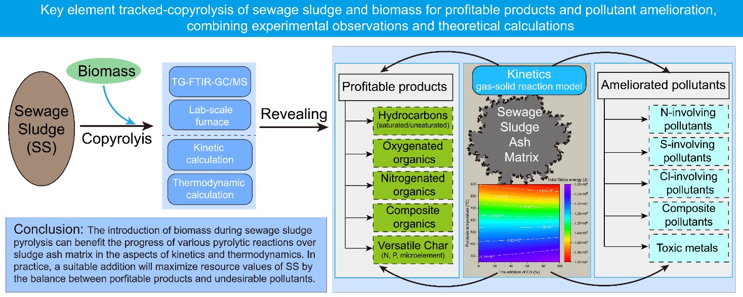 前期研究中,有别于现有的污泥热解研究思路与研究结果,李振山课题组在深入揭示污泥热解过程关键元素转化行为与迁移特征后,借助前沿热力学与动力学研究方法,提出“Sewage Sludge Ash Matrix”这一概念,描述调节污泥热解过程中有价产物提质与污染物原位转化两者间平衡关系,并证实污泥灰基热容是两者平衡的关键(如图1)。此项研究成果于2023年2月19日以“Key element course-tracked copyrolysis of sewage sludge and biomass for resource recovery and pollution control through kinetic and thermodynamic insights”为题发表于Energy Conversion and Management。
