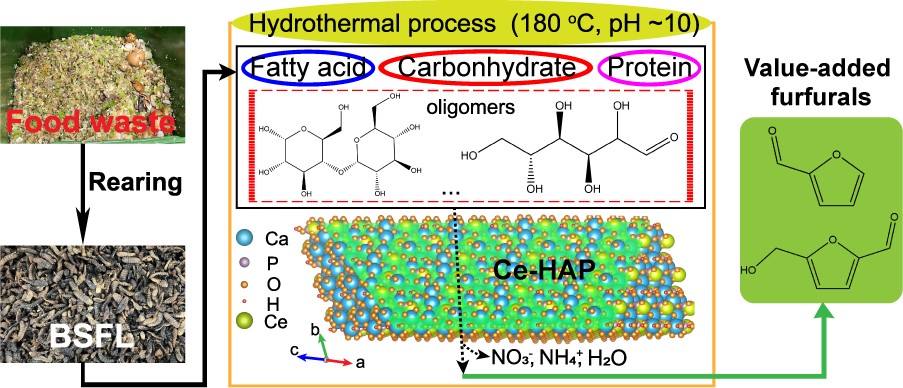 前期研究中,李振山课题组采用纳米化学与分子植物学交叉研究手段,定制合成了具有磷养分根际靶向递送功能的纳米羟基磷酸钙,并提出基于“水-肥”协作模式下植物养分纳米递送新机制(见图2)。该研究成果于2023年1月4日以“Morphology‐Tailored Hydroxyapatite Nanocarrier for Rhizosphere‐Targeted Phosphorus Delivery”为题在线发表于Small。同时,课题组进一步合成具有催化转化有机废物产高价值化学品功效的纳米羟基磷酸钙(见图3),此部分研究成果于2023年5月18日以“Exploration of Converting Food Waste into Value-Added Products via Insect Pretreatment-Assisted Hydrothermal Catalysis”为题发表于ACS Omega。