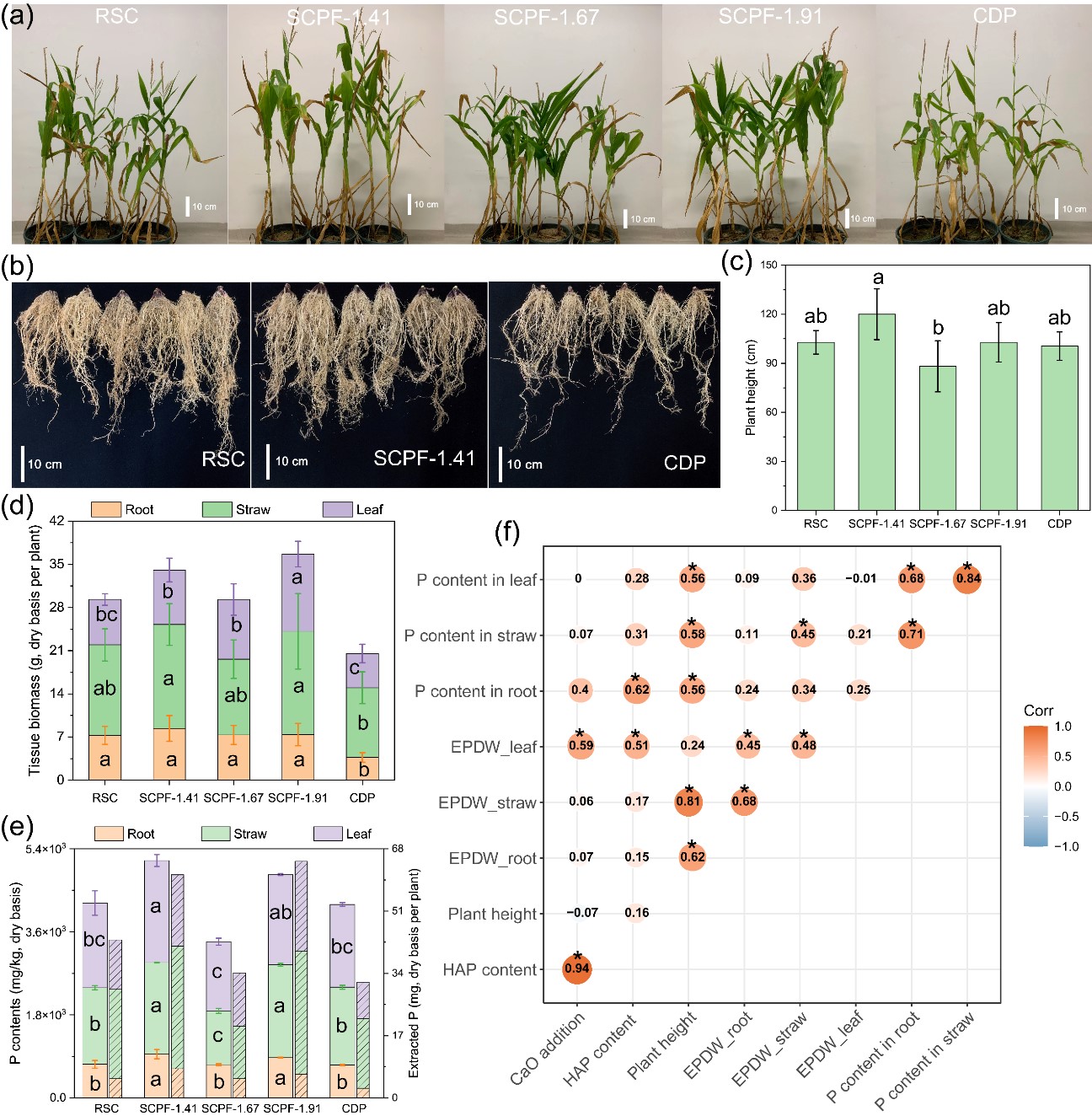 图4 污泥炭再生磷肥(SCPF)与传统化学磷肥(CPF)对玉米磷养分供给效果比较:(a)植物收获时长势外观,各组从左到右依次为施用原始污泥炭(RSC)、污泥原料Ca/P摩尔比为1.41制备的SCPF、污泥原料Ca/P摩尔比为1.67制备的SCPF、污泥原料Ca/P摩尔比为1.91制备的SCPF和CPF;(b)根系外观;(c) 株高;(d)根茎叶干重;(e)根茎叶组织含磷量及吸收的磷总量;(f)Pearson's 相关系数。显著性水平:P < 0.05 (n = 6)
