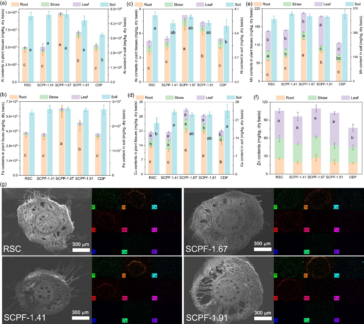 进一步地,为了深入考察制备的SCPF在供给植物所需磷养分时毒害金属迁移与转化行为,对植物根茎叶组织和非根际土进行了详细地重金属含量测定与空间分布解析,如图5所示。结果显示,在植物利用SCPF提供的磷养分时,这些毒害金属有不同程度地浸出,但未能显著进入植物体内,尤其地上部分。残留于土壤里的毒害金属,仅有铝、铜、镍相对于土壤背景值有不同程度升高。根部SEM-EDS分析证实,这些毒害金属主要聚集于根组织表面。