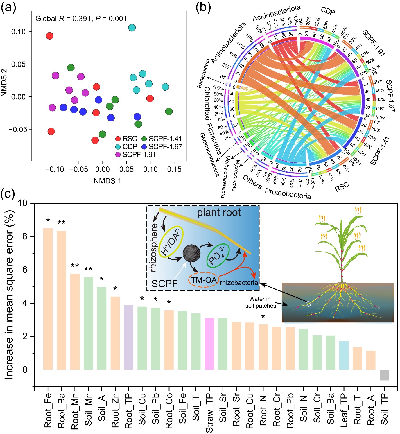 考虑到土著微生物在植物土壤磷养分利用过程中扮演的重要角色,对根际菌群落进行了相关测序分析(如图6),发现存在于非根际土里和根上的毒害金属是驱动根际菌群落演替的主要驱动力。借助图2中已阐明的植物缺磷响应机制(Phosphate starvation response,PSR),提出根系分泌物里小分子有机酸浸出SCPF中磷养分并协同毒害金属转化运移作用模式,并利用土壤异位实验进一步验证SCPF中磷与毒害金属浸出行为。