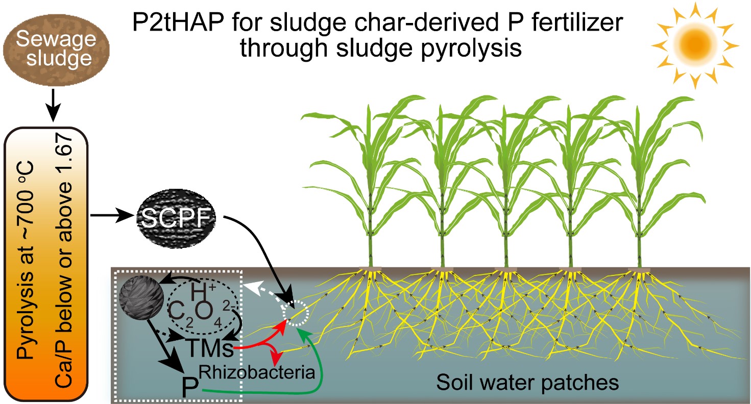 综合上述分析,以污泥原料Ca/P摩尔比为唯一变量来再利用污泥磷资源的P2tHAP技术,通过热解过程热动力行为精细调控,使制备的污泥炭再生磷肥在植物缺磷响应、根系分泌物与毒害金属配位、根际菌群落演替等多个作用界面上形成机制协同(见图8),更新了污泥超越传统废物处理处置的利用模式,为其他类似含磷废物可持续性资源化提供新模式。2023年6月28日,此研究成果作为研究论文,以“Targeting phosphorus transformation to hydroxyapatite through sewage sludge pyrolysis boosted by quicklime toward phosphorus fertilizer alternative with toxic metals compromised”为题,在线发表于Renewable and Sustainable Energy Reviews。