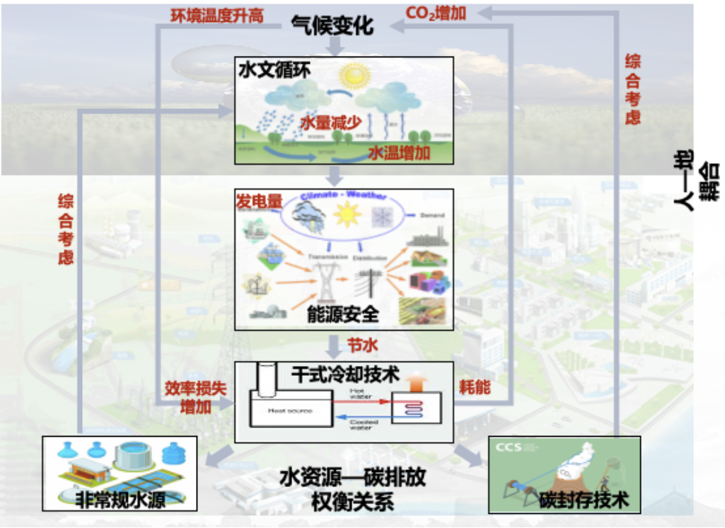 气候变化和水资源短缺是当前全球面临的两大重要挑战。火电行业作为全球最大的二氧化碳人为排放源,一方面是导致气候变化的重要原因(人类活动影响自然环境);另一方面,气候变化下水文循环的改变(如水资源稀缺、水温升高)又会严重制约火力发电,威胁能源安全(自然环境反馈人类社会)。能源行业冷却技术的转型(如采用干式冷却技术)可缓解火电行业面临的水资源压力,但同时存在热交换效率低、风机耗能高等缺点,且其发电效率和碳排放将进一步随着气候变化非线性增长。与此同时,非常规水资源利用及二氧化碳捕集技术则可能有效缓解诸如干式冷却技术带来的碳-水权衡效应。因此,在人地耦合视角下,综合冷却技术转型、非常规水源利用、以及碳封存等技术,识别电力部门的碳-水双向耦合机制,是气候变化及水资源短缺双重挑战下电力部门面临的重要科学瓶颈及现实问题之一。