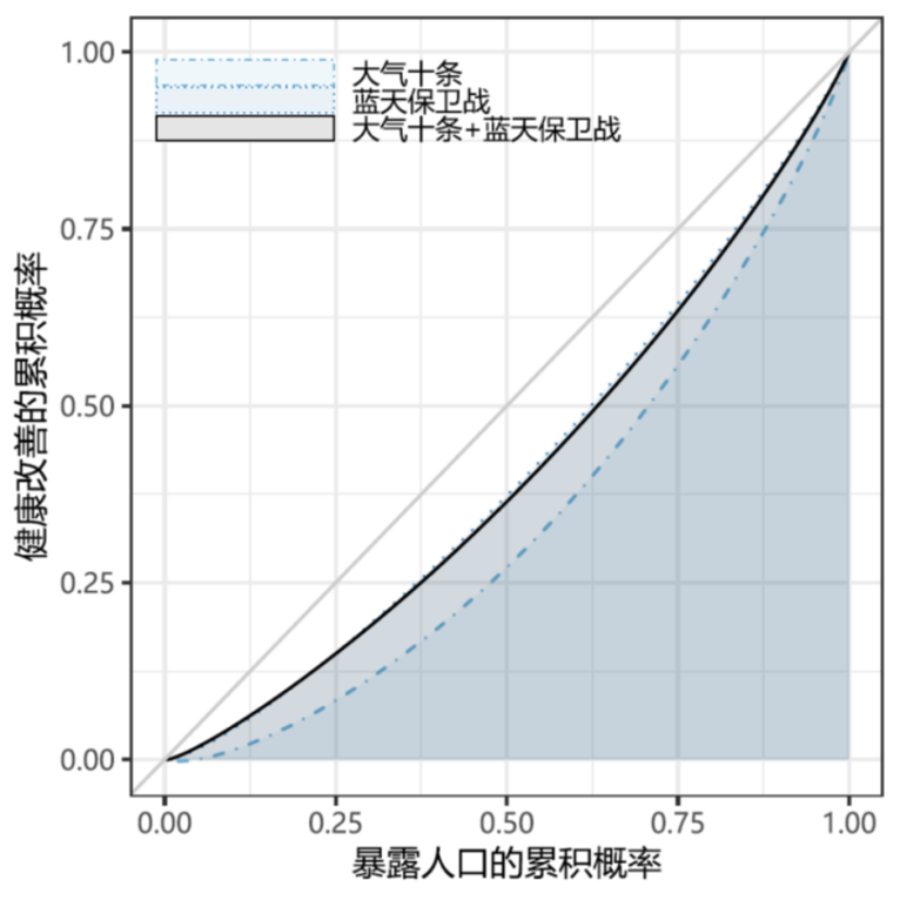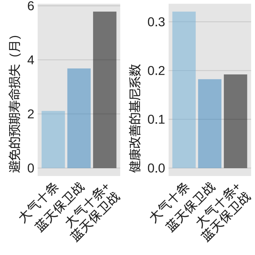 空气质量改善使得预期寿命增加,深度治理让更多人受惠。综合考虑PM2.5和O3暴露水平变化,“大气十条”期间,预期寿命增加1.94月,一半收益集中于约1/4人口,基尼系数为0.32;“蓝天保卫战”期间,预期寿命增加3.87个月,一半收益集中于1/3人口,基尼系数为0.18,地区之间的不平等现象有所缓解。
