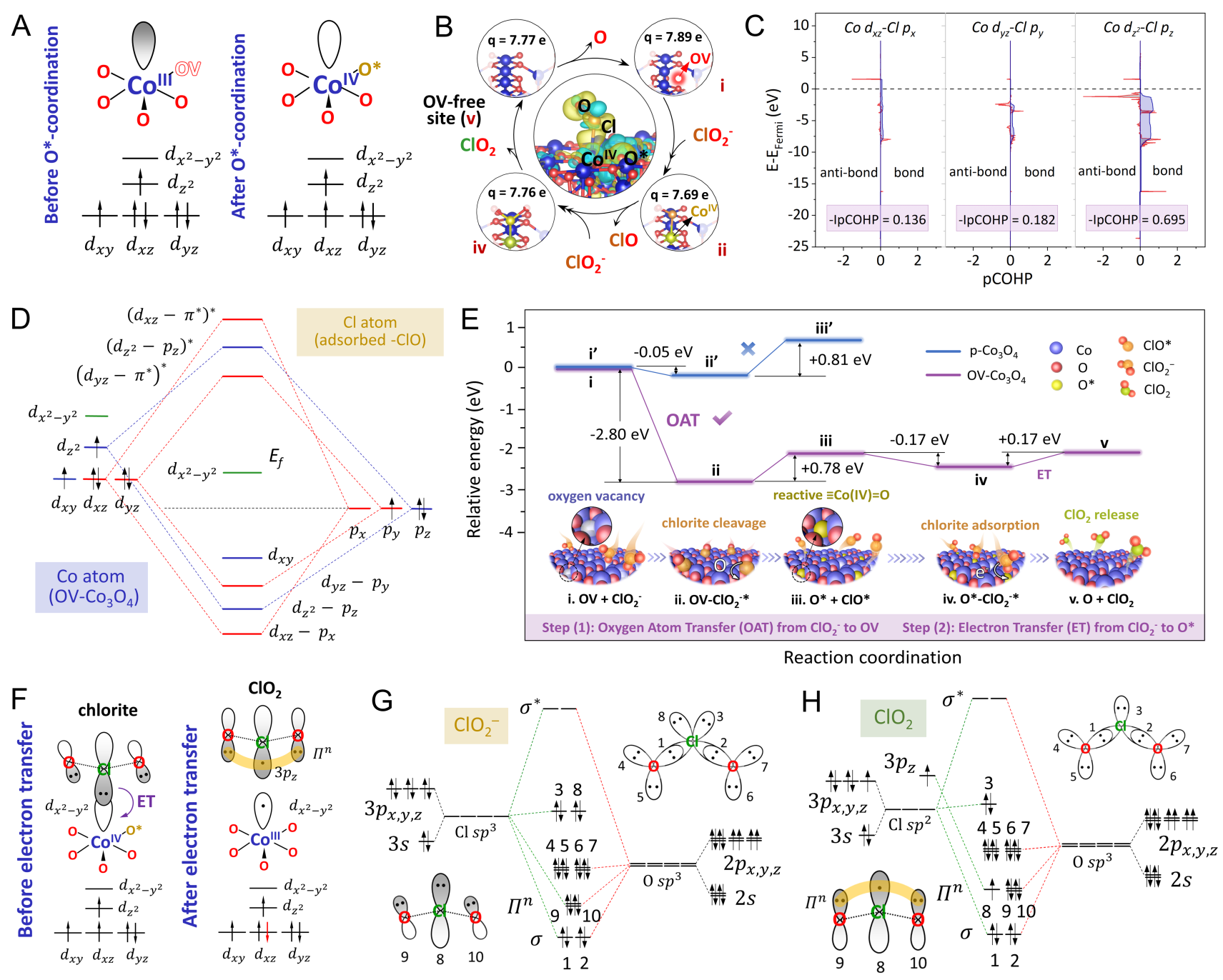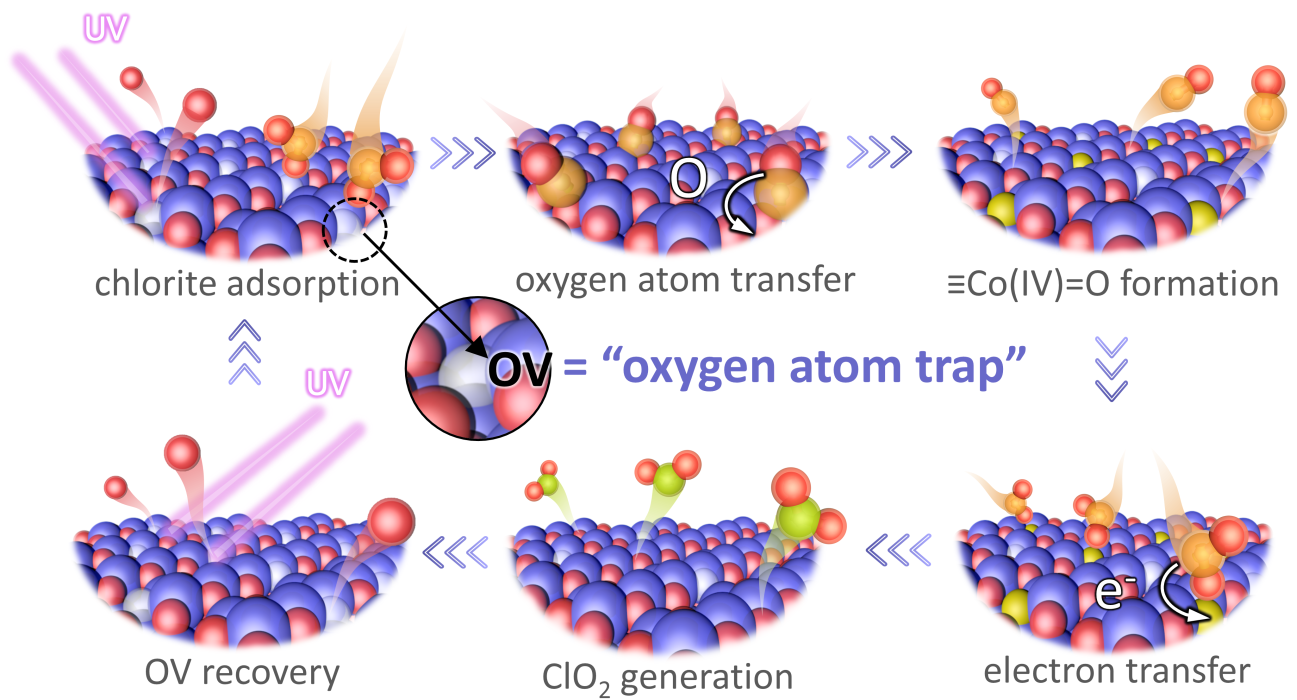 刘文研究员课题组多年来一直从事水处理高级氧化技术的研究工作,研发了多种适配于不同高级氧化体系的特异性功能材料。在过渡金属基材料非均相活化亚氯酸盐(ClO2–)的高级氧化工艺中,通过同步生成非均相高价金属物种和二氧化氯,可实现有机污染物的选择性氧化。然而,材料界面上的非均相高价金属物种在化学形态和演化机制上与均相高价金属物种不同,却常被混为一谈,因此亟待探清。课题组前期已经探索了传统Co3O4材料催化活化亚氯酸盐高级氧化体系的活性物种产生及污染物降解行为(Environ. Sci. Technol. 2023, 57, 5, 1882-1893;封面论文)。在此基础上,于新近研究中,课题组通过紫外诱导改性方法成功将光激发氧空位(OVs)引入Co3O4(OV-Co3O4)中,以促进亚氯酸盐的催化活化及水中新污染物的高效降解。实验表征结合理论计算表明,在OV-Co3O4/亚氯酸盐高级氧化系统中,引入的氧空位导致了低配位Co的产生,进而通过氧原子俘获作用可定向锚定ClO2–。首先,ClO2–经过O–Cl裂解,将解离的O原子转移到低配位的Co原子上,形成具有较高自旋态的≡Co(IV)=O;此后,≡Co(IV)=O从 ClO2–中提取一个电子生成二氧化氯(ClO2),并伴随着Co原子返回较低的自旋状态。激发所生成的高价钴(≡Co(IV)=O)和ClO2可实现有机新污染物(如磺胺类抗生素)的选择性降解。因此,本工作提出了一种通过构筑光激发氧空位作为氧原子俘获位点,以此来强化非均相高级氧化过程,并为通过缺陷工程调控≡Co(IV)=O的形成提供了新的见解。