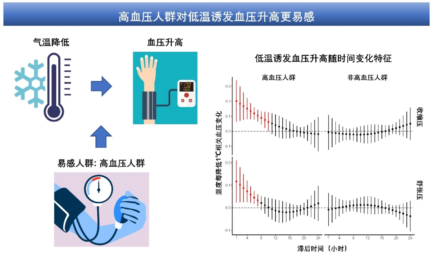 研究发现气温每降低1°C,高血压人群的收缩压和舒张压分别升高0.96和0.28 mmHg,显著高于非高血压人群(分别升高0.28和0.14 mmHg),表明高血压人群对气温诱发血压升高更易感。此外,气温下降后1小时内高血压人群的收缩压和舒张压即可发生显著升高,此后逐渐减弱直至约10小时后不再显著,提示气温下降后应当尽可能快地采取干预措施以预防高血压人群的血压升高,从而降低急性心血管事件发生的风险。本研究为高血压管理指南中进一步考虑环境气温的影响提供了重要的科学依据,并提示气候变化适应策略的制定应当充分考虑到易感人群。