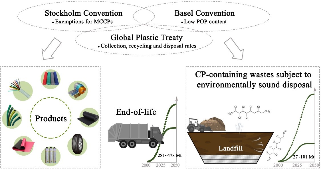 塑料是现代生产生活不可或缺的合成材料。在过去的半个多世纪中,全球塑料产量增长了超过20倍,至2022年已达4.3亿吨,并有望在未来20年内再翻一番。然而,历史上生产的塑料只有不到8%得到了回收利用,大量塑料废物被埋进了垃圾填埋场,或流入自然环境,产生了日益严峻的全球塑料污染问题。与现已引起国内外广泛关注的微塑料污染相比,各类塑料中所含有的多种有害塑料添加剂的环境和健康风险尚未引起充分关注。塑料中常用各种功能的塑料添加剂多达数百种,年产量超过2000万吨,其中包含多种对人体健康和生态环境具有潜在危害的有害化学品。这些有害化学品大多以非键合的方式存在于塑料基体中,在塑料制品的生命周期各阶段释放进入环境,发生远距离输送和长期累积,带来环境和健康风险。其中,短链和中链氯化石蜡(SCCPs和MCCPs,下简称CPs)是全球用量最大的塑料添加剂之一,作为增塑剂兼阻燃剂,以每年数十万吨的规模广泛应用于电线电缆、软门帘、地垫和薄膜等聚氯乙烯(PVC)塑料制品、聚氨酯(PU)粘合剂以及合成橡胶制品中。然而,SCCPs和MCCPs也是迄今所知全球产量最大的一类持久性有机污染物(POPs),具有环境持久性、生物蓄积性及多种潜在的环境、健康危害性。