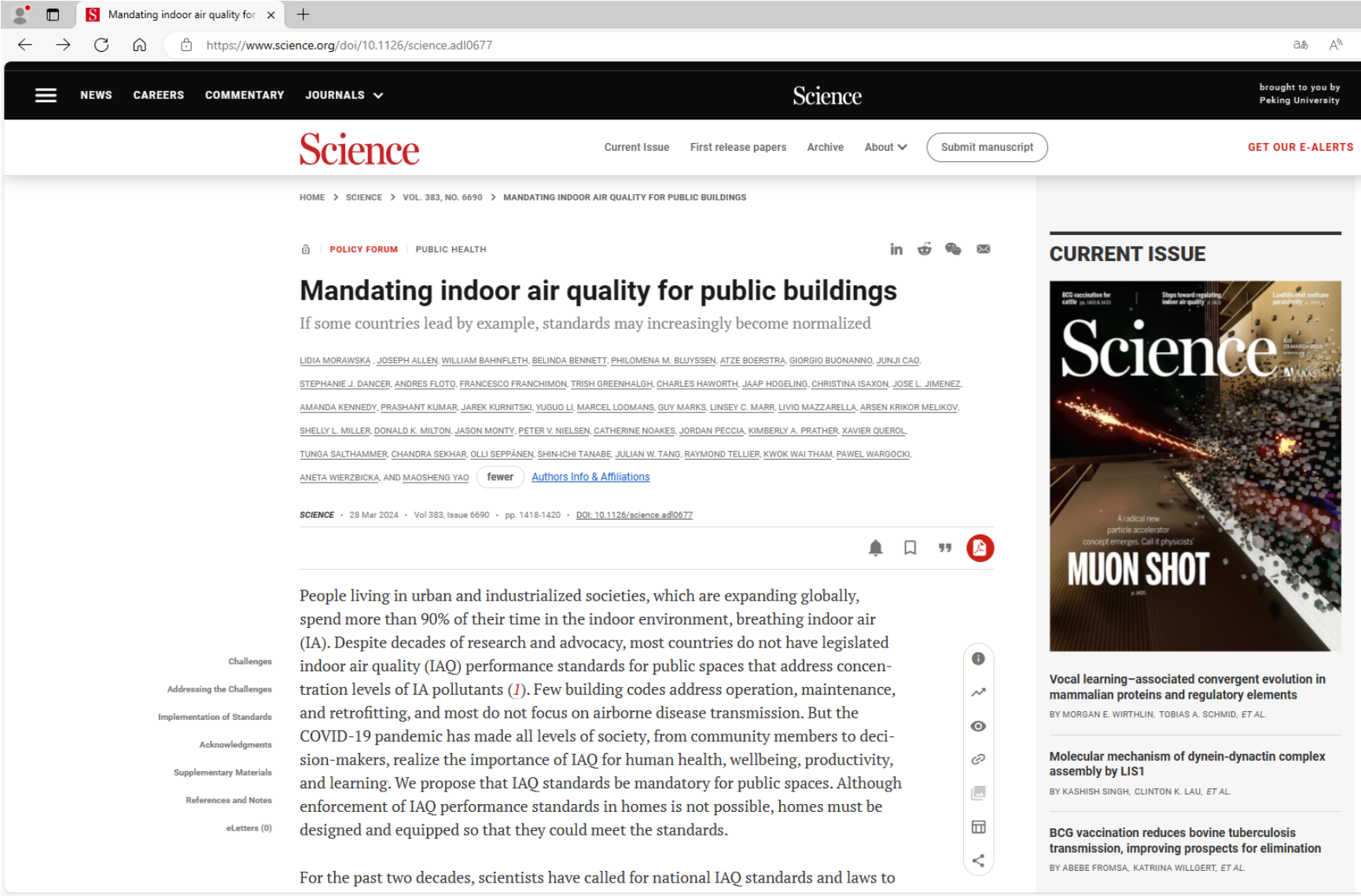 Lidia Morawska*, Joseph Allen, William Bahnfleth, Belinda Bennett, Philomena M. Bluyssen, Atze Boerstra, Giorgio Buonanno, Junji Cao, Stephanie J. Dancer, Andres Floto, Francesco Franchimon, Trish Greenhalgh, Charles Haworth, Jaap Hogeling, Christina Isaxon, Jose L. Jimenez, Amanda Kennedy, Prashant Kumar, Jarek Kurnitski, Yuguo Li, Marcel Loomans, Guy Marks, Linsey C. Marr, Livio Mazzarella, Arsen Krikor Melikov, Shelly L. Miller, Donald K. Milton, Jason Monty, Peter V. Nielsen, Catherine Noakes, Jordan Peccia, Kimberly A. Prather, Xavier Querol, Tunga Salthammer, Chandra Sekhar, Olli Seppänen, Shin-ichi Tanabe, Julian W. Tang, Raymond Tellier, Kwok Wai Tham, Pawel Wargocki, Aneta Wierzbicka, Maosheng Yao (2024), Mandating indoor air quality standards for public, Science, DOI: 10.1126/science.adl0677.