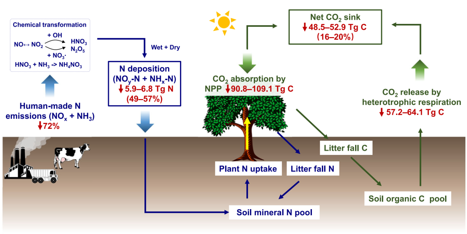 我国计划在2060年前实现碳中和目标,并提出“减污降碳”政策以达到改善空气质量和缓解气候变化的双赢。期间,将大幅减少人类化石燃烧排放的氮氧化物和养殖业与种植业排放的氨等活性氮物质。这将减少大气氮沉降,进而对陆地生态系统碳汇产生调控作用,并影响碳中和目标的实现。准确认识这种复杂的关联效应,可为未来制定更加合理的碳中和政策提供科学依据。