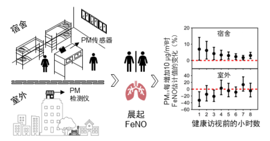 夜间宿舍内外PM2.5与次日晨间FeNO估计值之间不同关联模式示意图