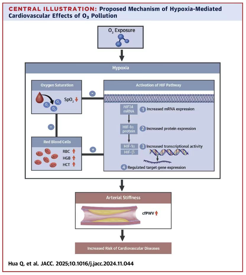 值得关注的是,该研究不仅构建了"臭氧暴露-缺氧应激-动脉硬化"的新型作用通路(图1),更通过多维度生物标志物分析揭示了分子层面的调控机制。JACC同期发表了编辑评述“The Pathogenetic Link Between Ozone Pollution and Cardiovascular Disease”。