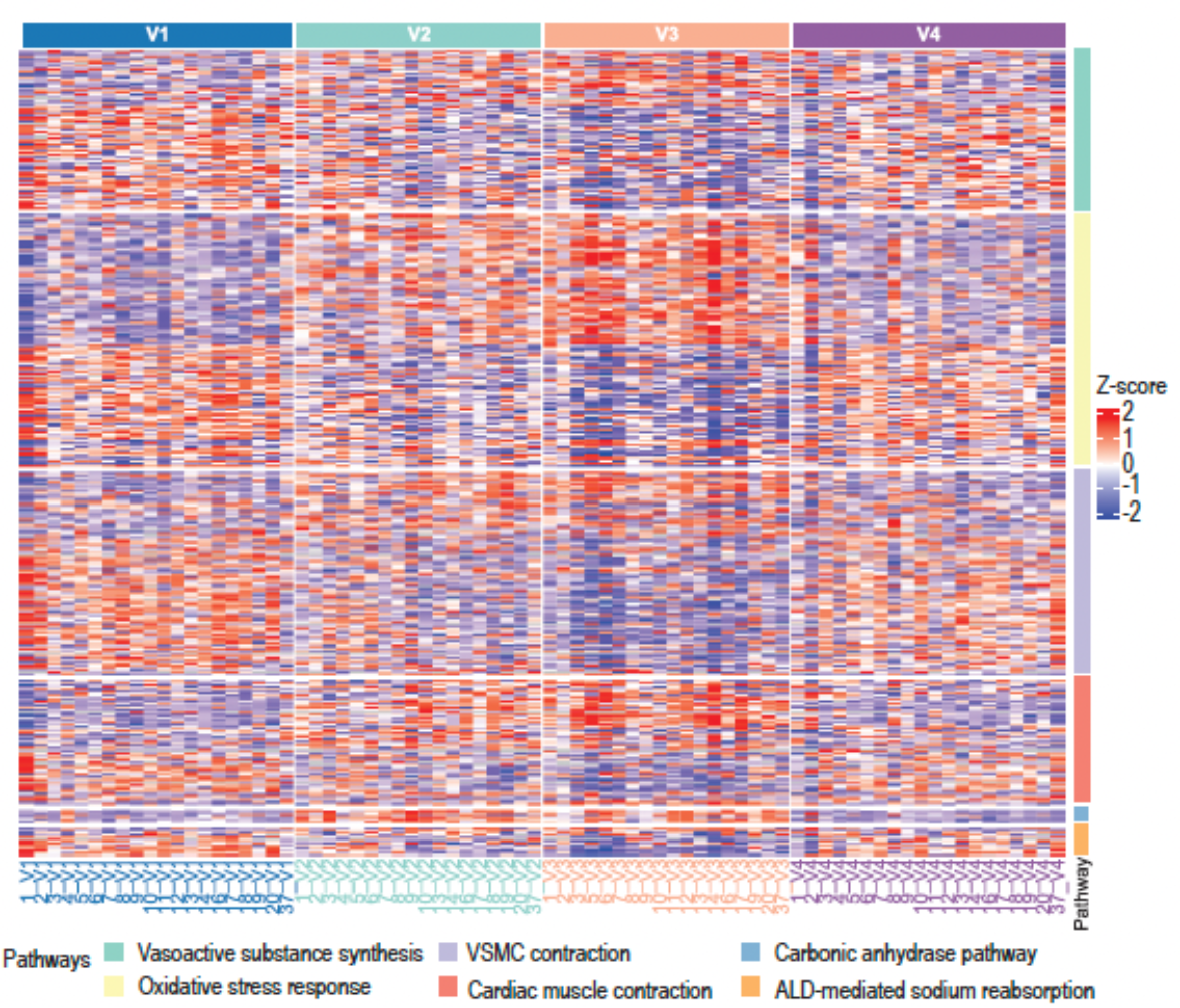 进一步的转录组学分析揭示,人体暴露于高海拔缺氧环境时,血流动力学相关的多条通路呈现出激活(activation)与抑制(counterbalance)并存的状态。例如,参与血管与心肌收缩和舒张的基因表达均上调;同时,促氧化酶与抗氧化酶的基因表达亦同步上调。这表明机体通过一种拮抗性、代偿性的调节机制来驱动对高海拔缺氧环境的适应过程。部分基因表达的变化随高海拔暴露时间延长而更为显著,提示生理适应性调节逐步强化。当受试者返回低海拔后,相关基因表达恢复至基线水平,与血流动力学指标的变化趋势一致,体现了机体对短期高海拔生理应激具有可逆的恢复能力(图3-4)。