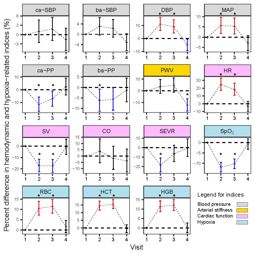 研究系统揭示了人体暴露于高海拔环境后血流动力学的适应性特征,及其返回低海拔的可逆性(图2)。在急性高海拔暴露初期,受试者舒张压(DBP)显著升高11%,每搏输出量(SV)降低17%,同时心内膜下心肌活力率(SEVR)下降19%,提示心肌氧供与氧需出现失衡。随着高海拔停留时间延长(约1周),血流动力学指标逐渐趋于稳定,大部分指标恢复至接近基线水平,显示出良好的可逆性。值得注意的是,受试者返回低海拔后,脉搏波传导速度(PWV)显著下降12%,舒张压(DBP)亦下降5%。这些变化提示,短期高海拔暴露后返回低海拔环境,可能对部分血流动力学指标有改善作用。