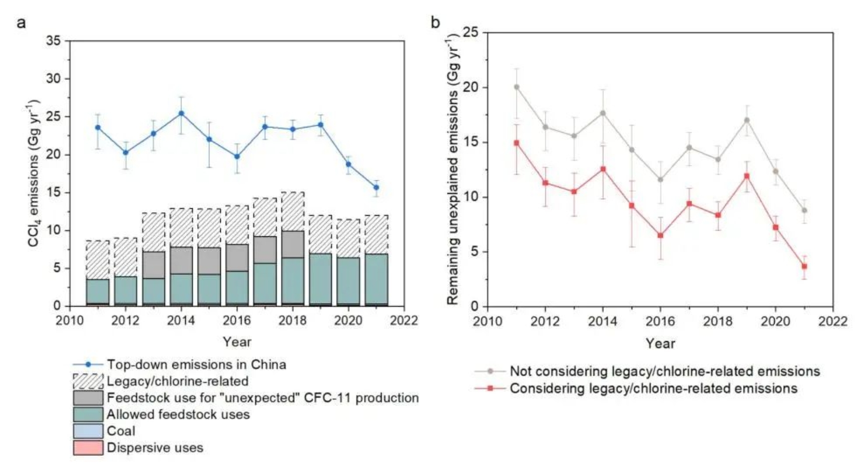 然而,四氯化碳(CCl4)作为最早受控的关键物质之一,过去20余年期间其基于大气观测反演的排放量一直高于采用各国报告生产和消费量计算的排放量超万吨/年。四氯化碳排放问题也是自2005年以来《蒙特利尔议定书》缔约方大会每年都会涉及的议题。与主要是延时排放的CFCs和哈龙不同,被认为是瞬时排放的四氯化碳,却在2010年全球禁止其生产和使用后依然维持高水平排放量,成为制约臭氧层进一步恢复的重要因素之一。