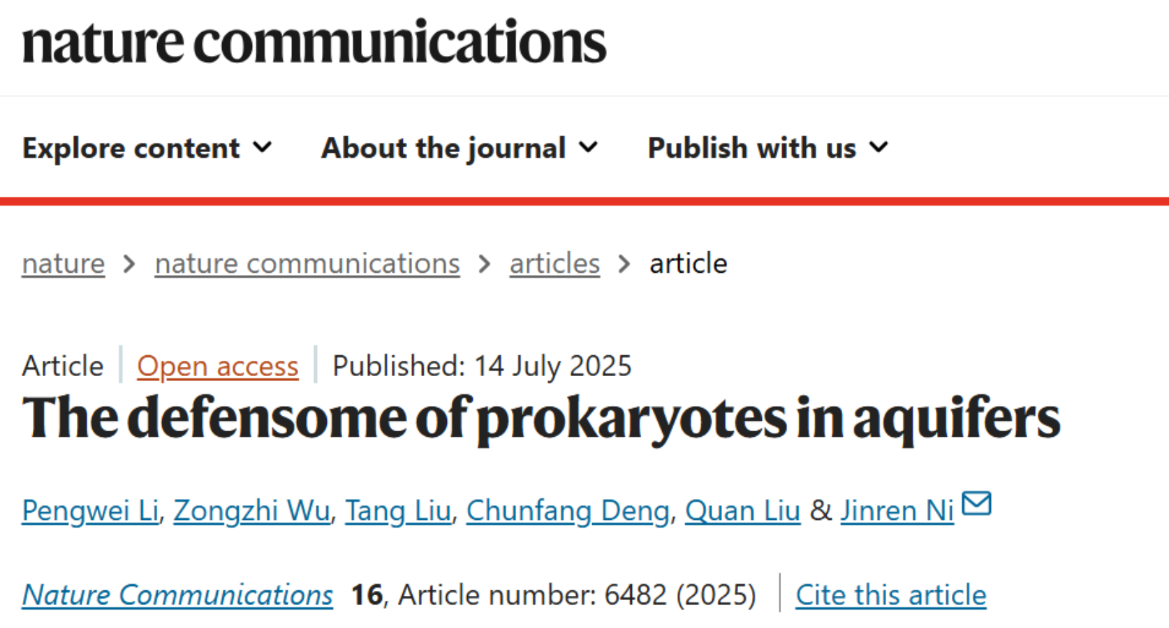 该研究得到了国家自然科学基金联合基金重点支持项目(No. U2240205)和国家自然科学基金委创新研究群体项目(No. 51721006)的资助。研究成果以“The defensome of prokaryotes in aquifers”为题,于2025年7月14日在线发表于Nature Communications。倪晋仁教授为论文通讯作者,博士生李鹏伟为第一作者。