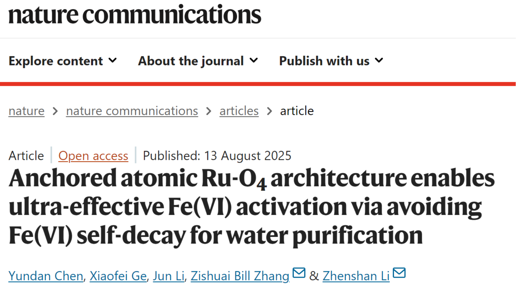 上述研究成果以“Anchored atomic Ru-O4 architecture enables ultra-effective Fe(VI) activation via avoiding Fe(VI) self-decay for water purification”为题,于2025年8月13日在线发表于Nature Communications。北京大学环境科学与工程学院陈赟丹博士后为论文的第一作者,北京大学环境科学与工程学院李振山教授、张子帅研究员为论文的共同通讯作者,论文的其他作者还包括上海交通大学变革性分子前沿科学中心李俊研究员和北京大学环境科学与工程学院博士生葛晓菲。该研究得到了国家重点研发计划(2022YFC3201801)、国家自然科学基金(41171005、22478008)等项目的资助。