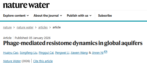 该研究得到了国家自然科学基金联合基金重点支持项目(No. U2240205)和国家自然科学基金委创新研究群体项目(No. 51721006)的资助。研究成果以“Phage-mediated resistome dynamics in global aquifers”为题,于2026年1月5日在线发表于NatureWater。倪晋仁教授为论文通讯作者,他指导的研究生曹怀玉为第一作者。