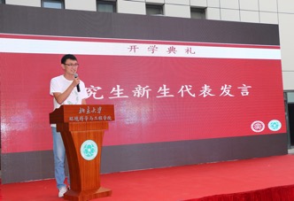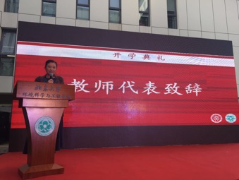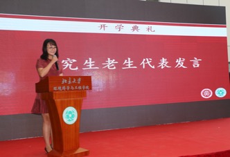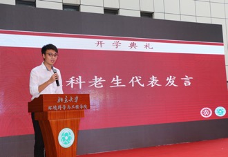 周丽玮同学则首先代表全体研究生向各位老师致以最诚挚的祝福。她回忆起自己几年来在老地楼、技物楼和学院新楼做实验的点点滴滴,感悟学院软硬件设施的日臻完善。随后她交流了自己在燕园成长进步的心得,提醒新生们要充分利用好身边的资源,养成独立思考不随波逐流的习惯,要为自己进入北大环院感到自豪,但不要骄傲,并相邀大家一同书写环境人的理想篇章。