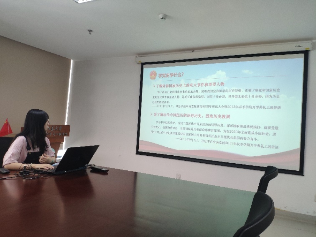 会议伊始,第二党小组组长冯一鸣同志为各位学生党员讲解了为什么要学党史,学党史应该学什么,如何学党史这三个重要问题。历史是最好的教科书,学党史的目的,是用党的奋斗历程和伟大成就鼓舞斗志、明确方向,是用党的光荣传统和优良作风坚定信念、凝聚力量,是用党的实践创造和历史经验启迪智慧、砥砺品格。学党史要了解党和国家历史上的重大事件和重要人物,要了解近代中国经历的屈辱历史,汲取历史教训。在学党史的过程中,要坚持运用唯物史观准确认识和把握历史,要学会全面、客观、历史、辩证地看待历史人物。随后,冯一鸣同志以《中国共产党简史》为基础,为各位党员梳理了中国共产党的百年历史大事记,并详细的为各位党员讲解了中共一大的召开背景、过程和意义。