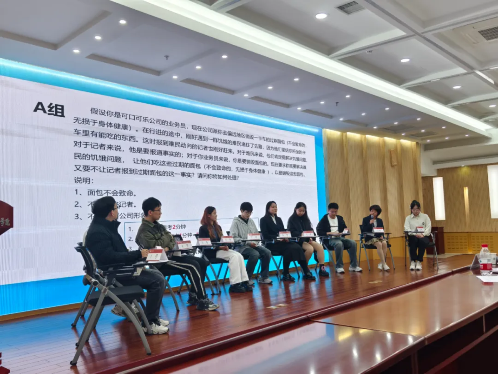 无领导小组讨论是本次大赛的亮点之一。分为A、B、C三组的同学们分别围绕领导力、企业社会责任、利益与伦理平衡等相关议题开展了激烈的讨论。讨论结束后,嘉宾们对同学们的表现进行了深入点评。陈鸥分享了重大事项决策的思路,任传慧从面试技巧的角度提供了多项选择中的分类法等技巧,而陆潘涛则以自身经历向同学们分享了宝贵的经验。