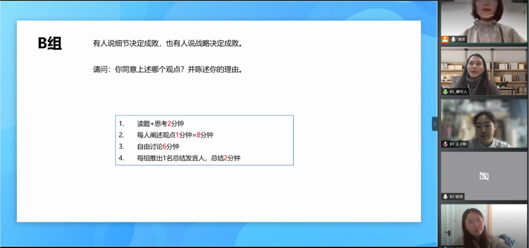 第二组选手针对下图问题总结出以下观点:战略更为重要,必须找准方向,才有可能获得成功,而细节可以列入战略的规划中。