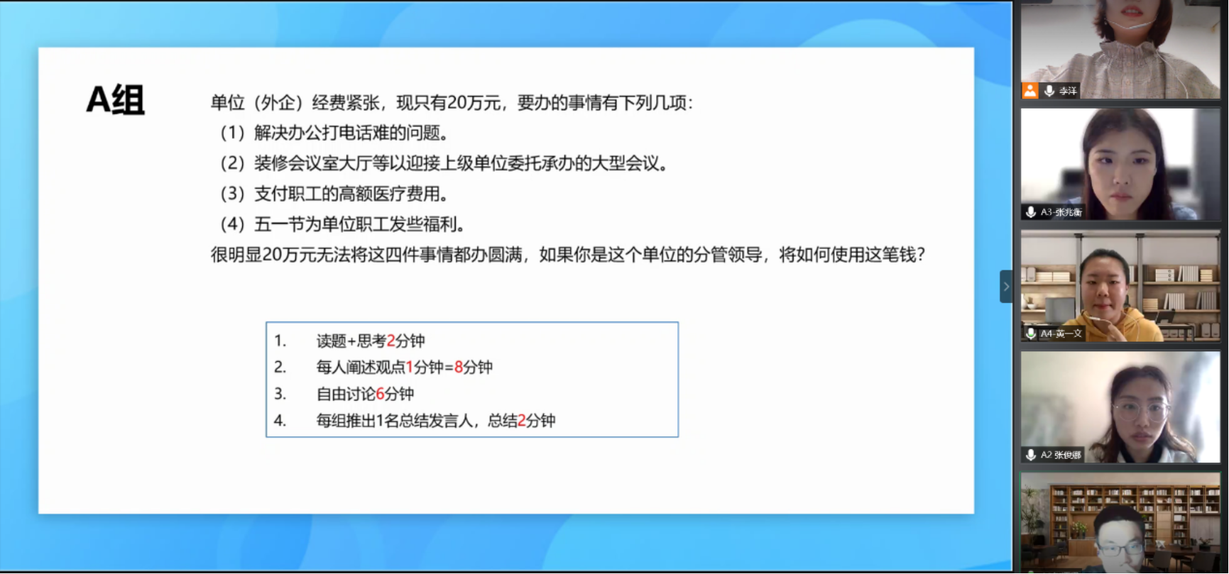 第一组选手针对下图问题总结出以下观点:经费根据2:8:8:2的比例进行分配,1必须优先解决,2是形象工程,3是员工福利,2和3同等重要,4排在最后解决。