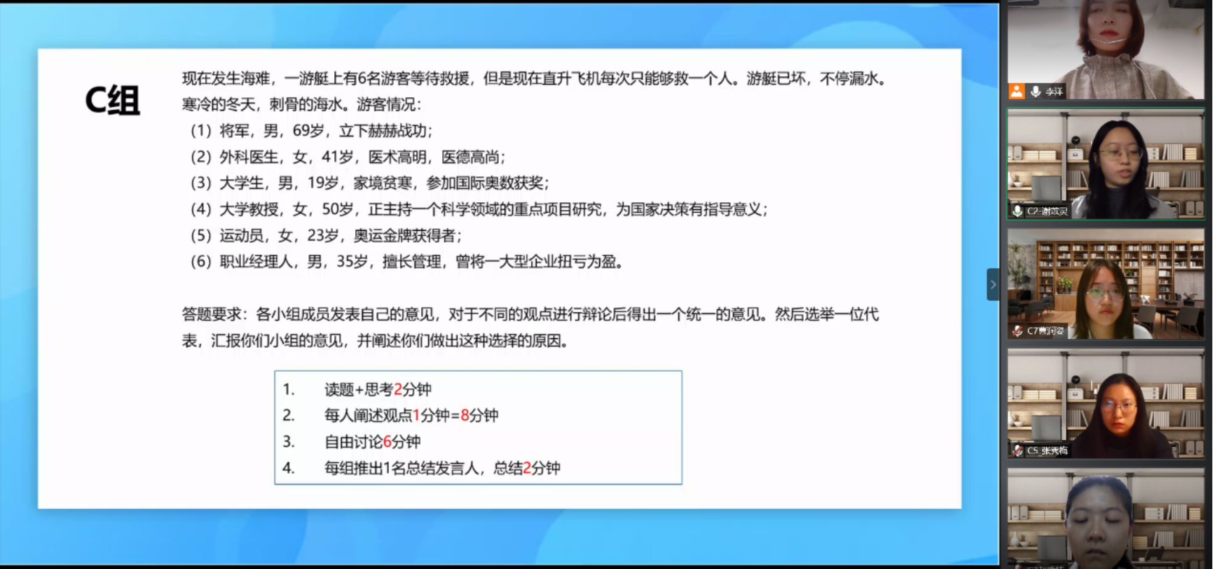 第三组选手针对下图问题总结出以下观点:根据身体情况和社会贡献得出以下排序,将军(年龄最大)、大学教授(社会贡献最大)、职业经理人、大学生、外科医生(对其他游客有帮助)、运动员。