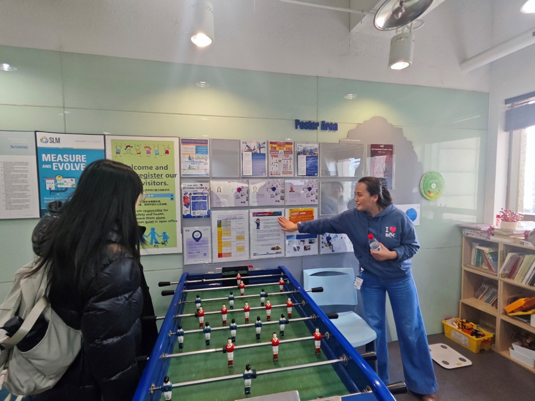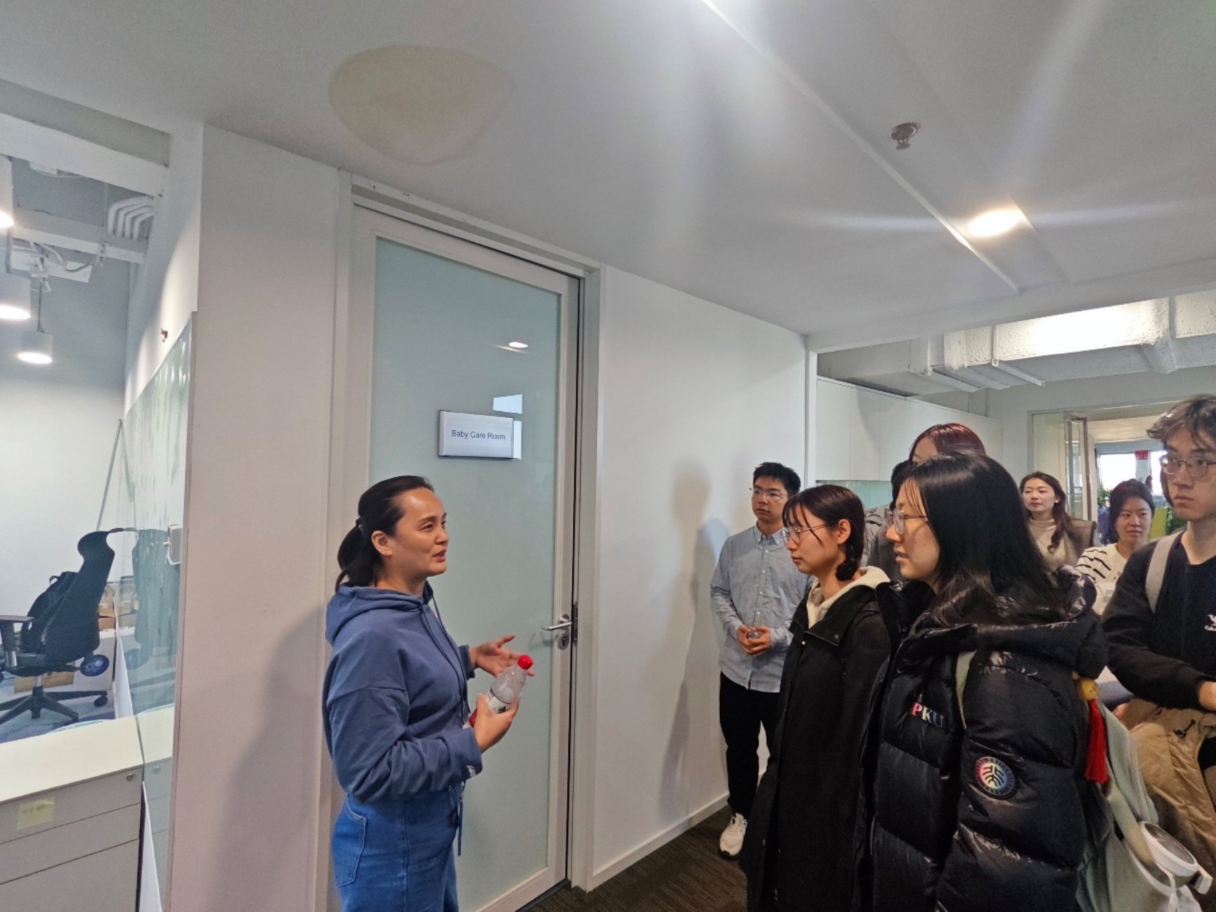 师生们在工作人员引导下参观了北京地球科学中心办公区。大家依次走访了各部门工作区域,了解办公环境与安全指引,体验升降座椅等人性化设施,并参观了关怀小屋、母婴室、茶水间和按摩室等员工关怀场所。